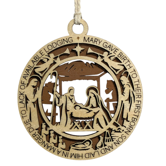 Handcrafted 3.5" Wooden Christmas Ornament, 2-Layer Laser Cut, Featuring Luke 2:7 Manger Scene with Mary, Joseph & Baby Jesus, Christian Icons, Made in USA, Perfect Holiday Decor Gift