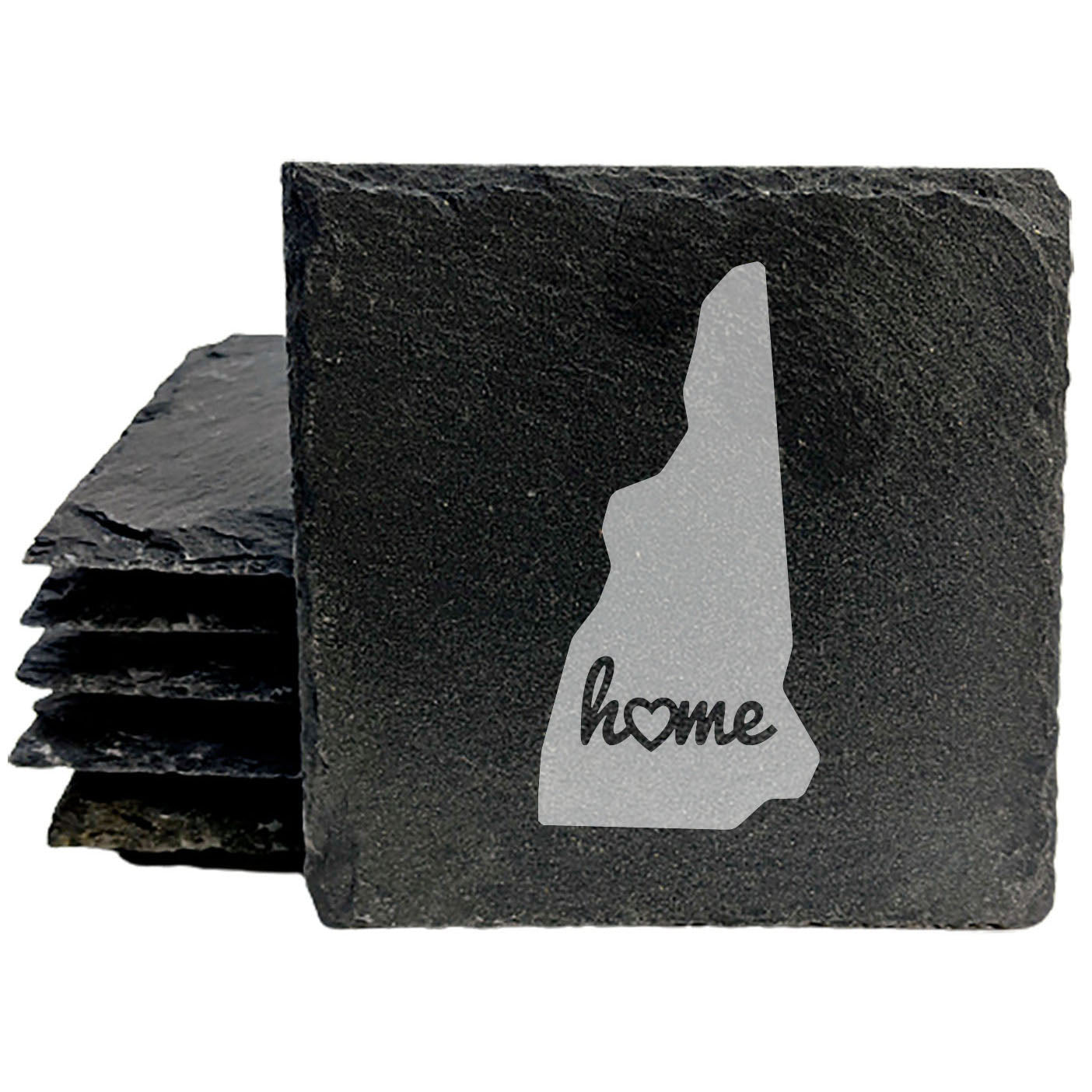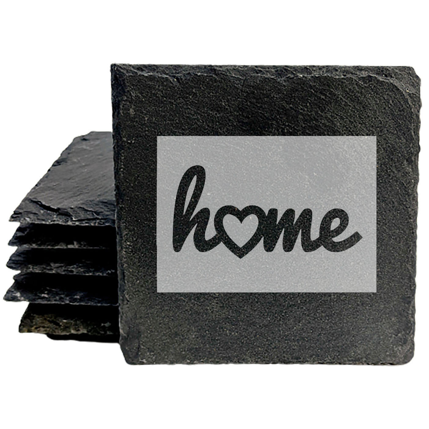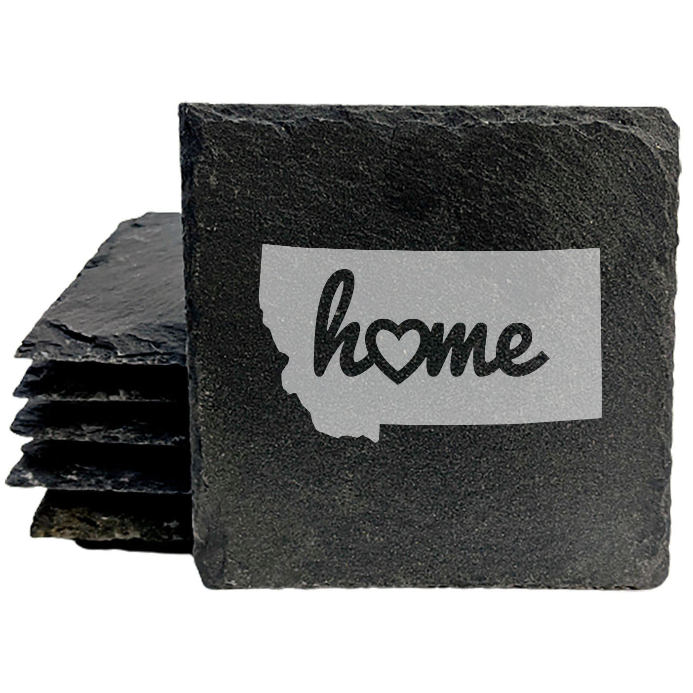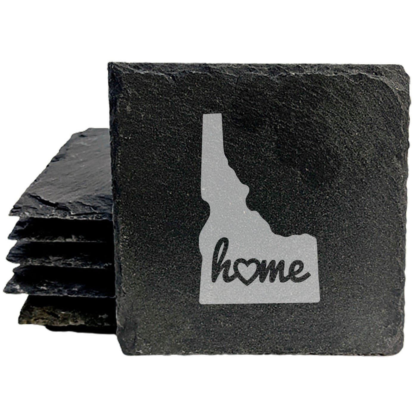 Rustic Slate Coasters Set of 4 - Idaho 'Home' Design with Heart - Perfect Gift for Holidays, Birthdays, Housewarming - Round 4" - Natural Chipped Edge, Rubber Feet - Made in Oregon, USA