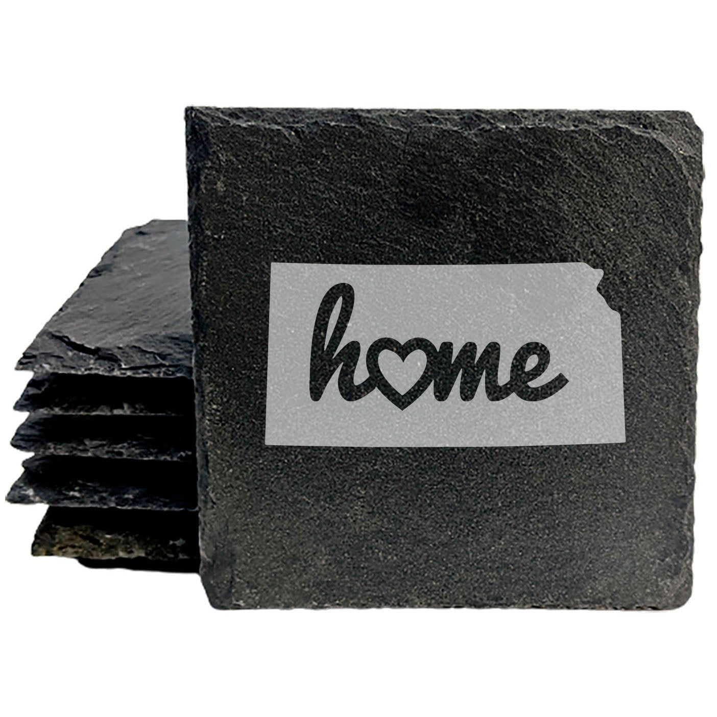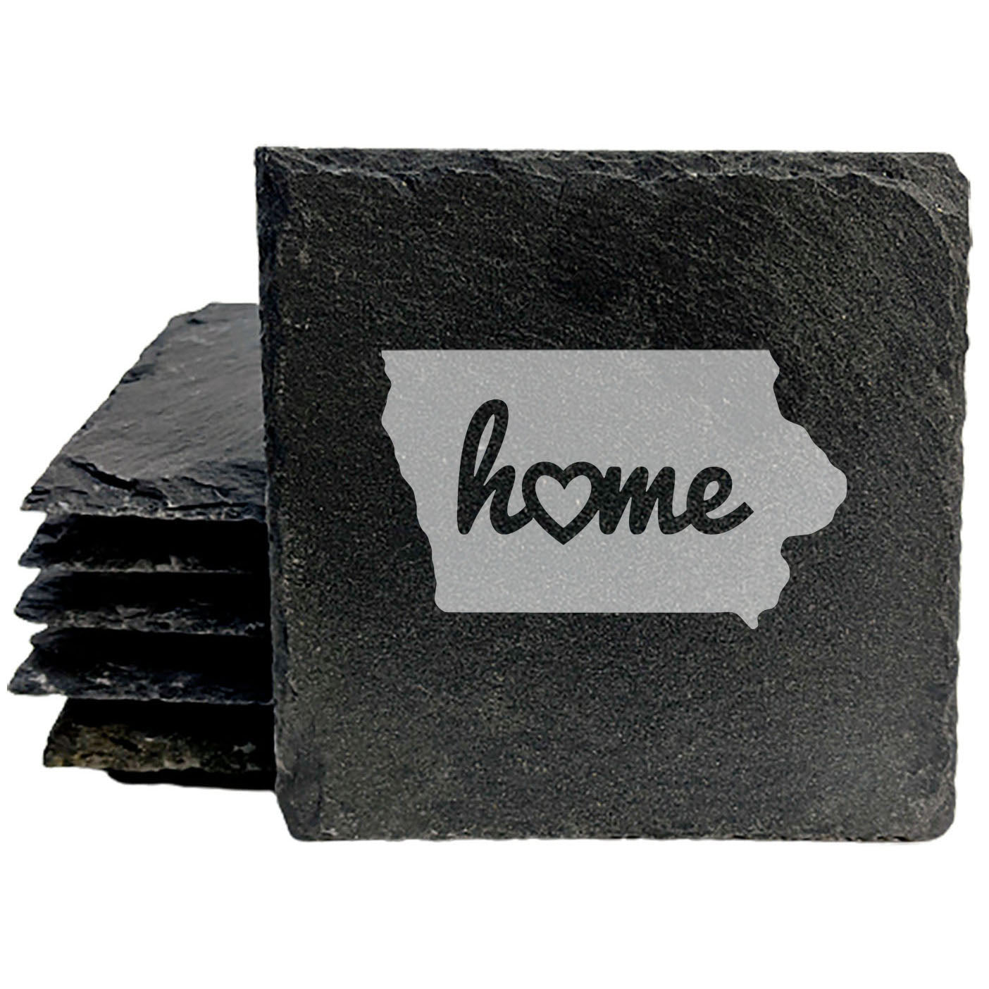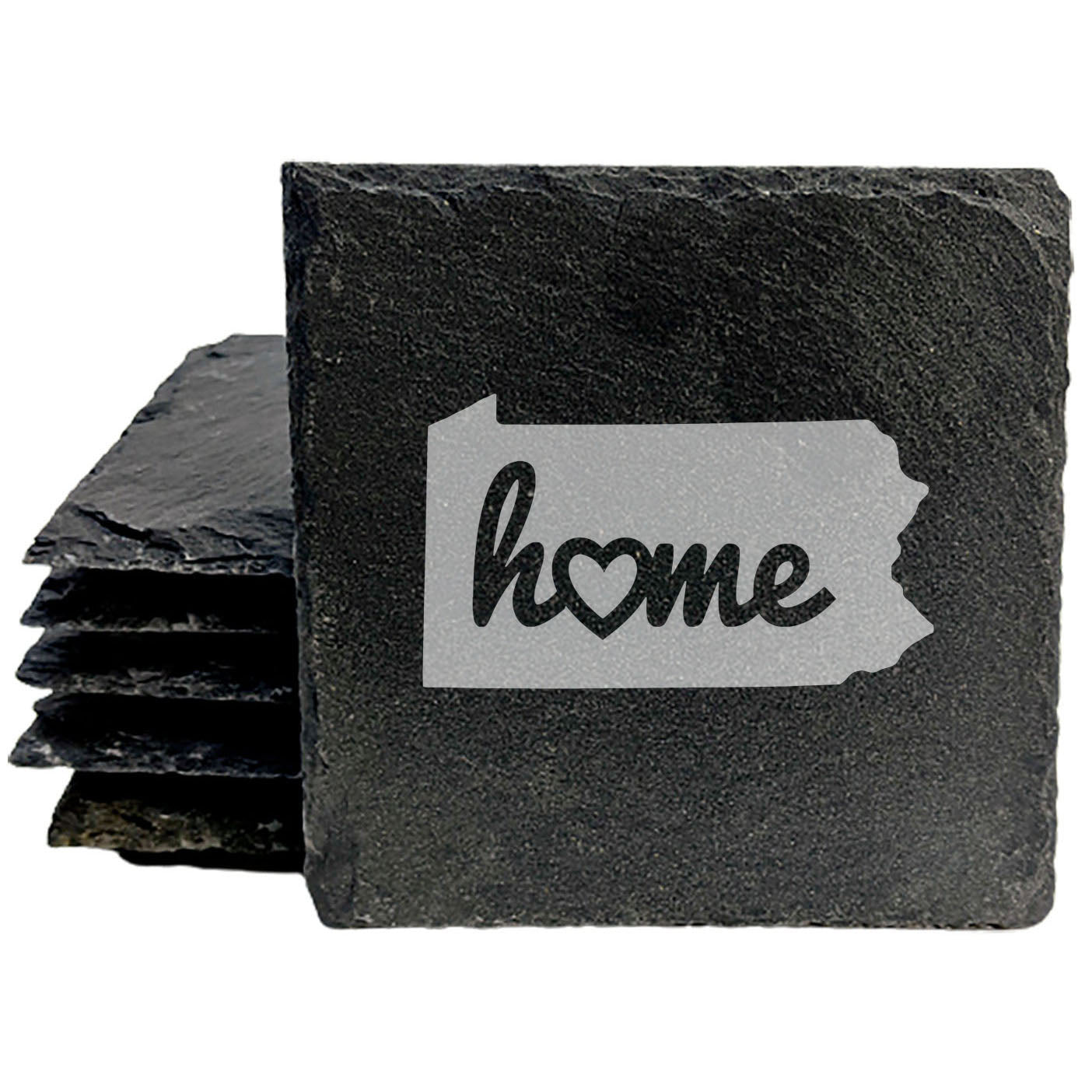 Rustic Slate Coasters Set of 4 - Idaho 'Home' Design with Heart - Perfect Gift for Holidays, Birthdays, Housewarming - Round 4" - Natural Chipped Edge, Rubber Feet - Made in Oregon, USA