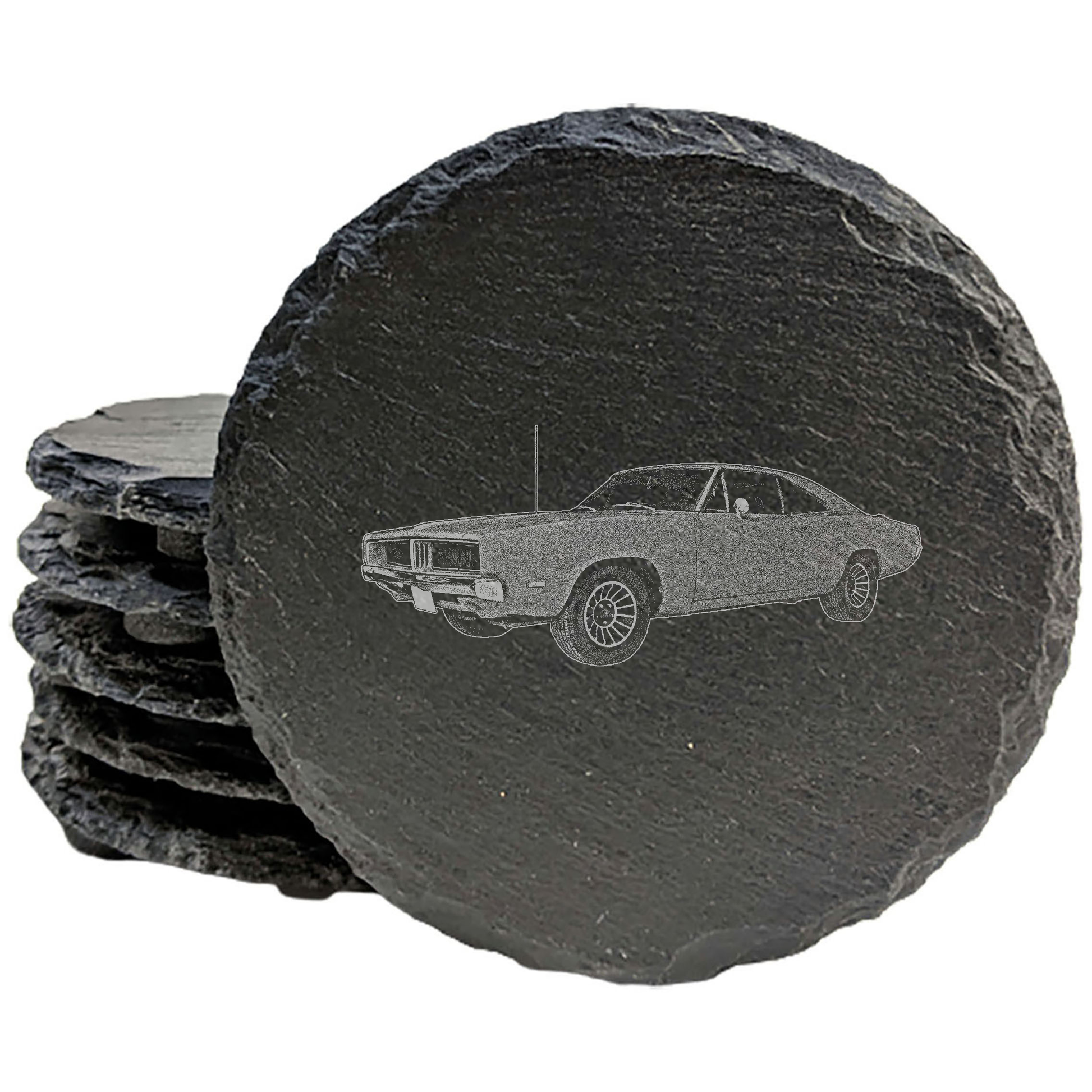 Handcrafted from natural gray slate, each coaster boasts a unique, chipped edge that adds a touch of rustic charm to your man cave, garage, or any space where you celebrate the power and performance of classic cars. This special set showcases four captivating laser-etched designs of the 1969 Dodge Charger, capturing its aggressive stance and timeless design from different angles. It's a permanent and conversation-starting addition to your automotive haven.**