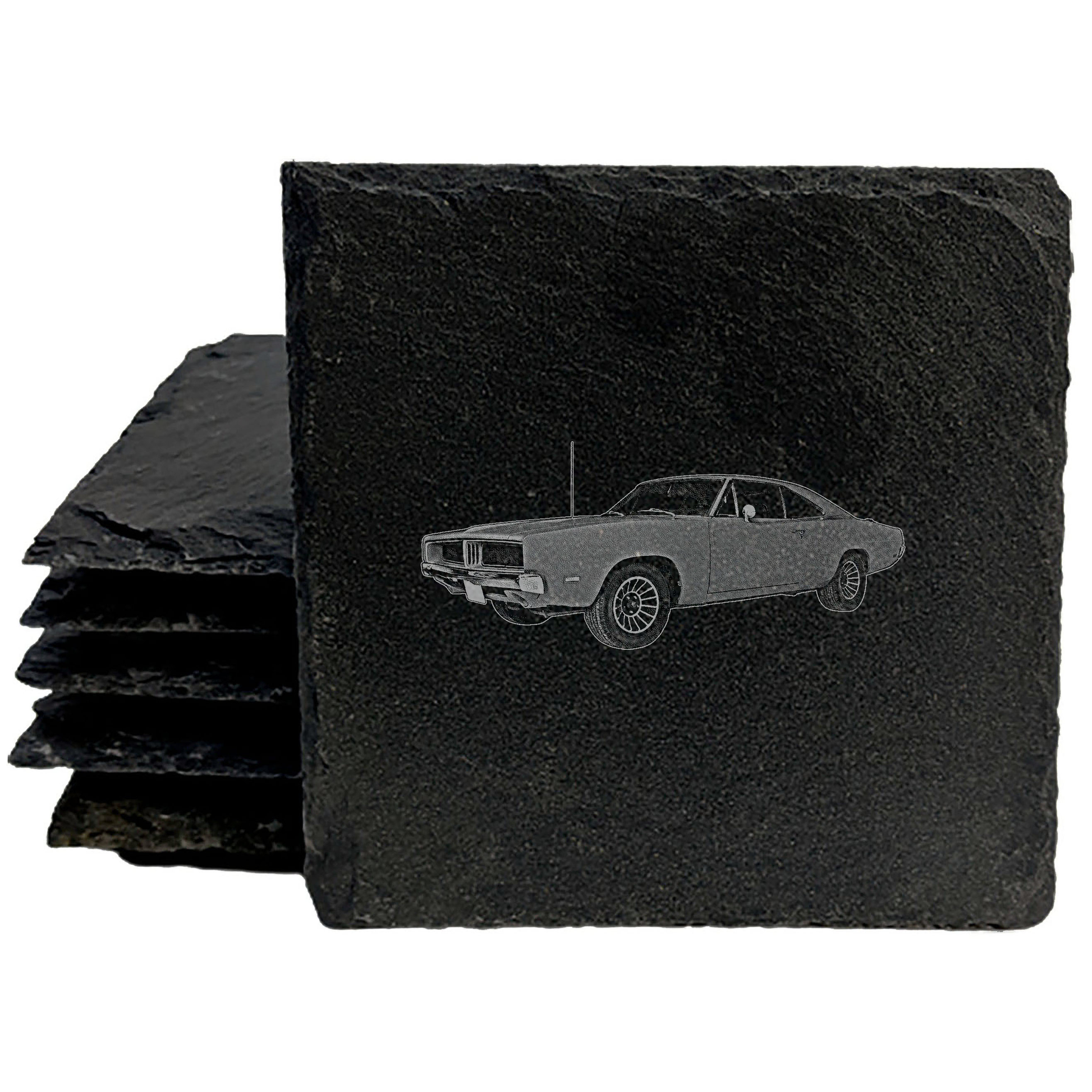 Rev up your nostalgia with this one-of-a-kind set of slate coasters featuring four iconic images of the legendary 1969 Dodge Charger!