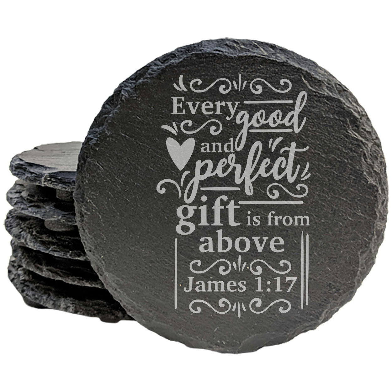 Elevate your home decor and inspire meaningful conversations with these captivating rustic gray slate coasters, each featuring a timeless inscription: "Every good and perfect gift is from above," James 1:17.
