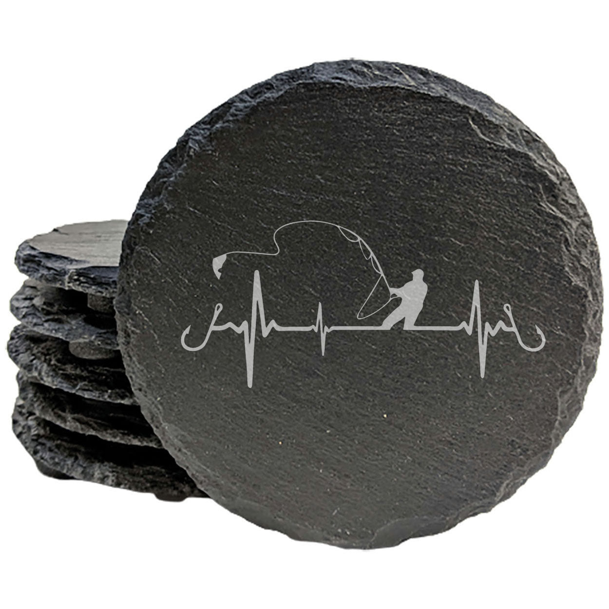 Feel the pulse of your passion for fishing with these captivating rustic gray slate coasters, featuring a laser-etched design that merges an EKG heartbeat with the thrill of the catch. The intertwined lines transform into fishing hooks, symbolizing the rhythm of excitement that races through every angler's heart as they fight to reel in their prize. In the center, a determined fisherman battles a hooked fish, capturing the essence of the sport's challenge and reward.