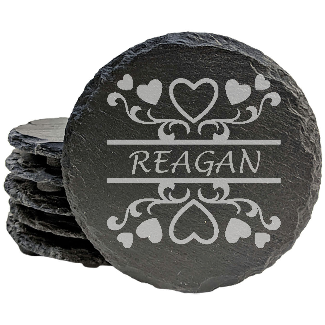 Celebrate love and add a touch of rustic charm to your home with these unique slate coasters, featuring a laser-etched split monogram design that incorporates a beautiful, swirling heart!