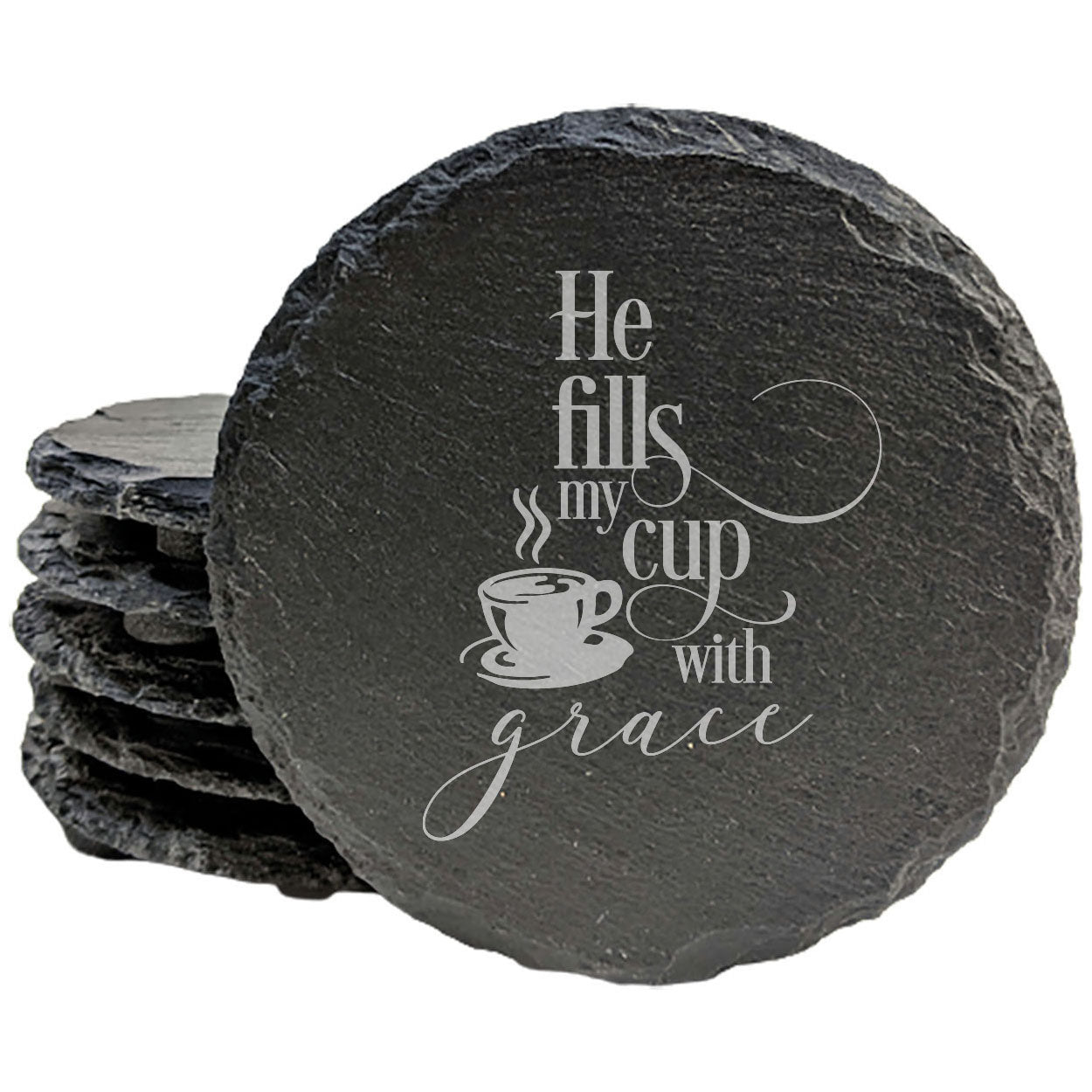 Faith and Hope: Laser Etched Slate Coasters: Christian Gift - "He Fills My Cup with Grace"