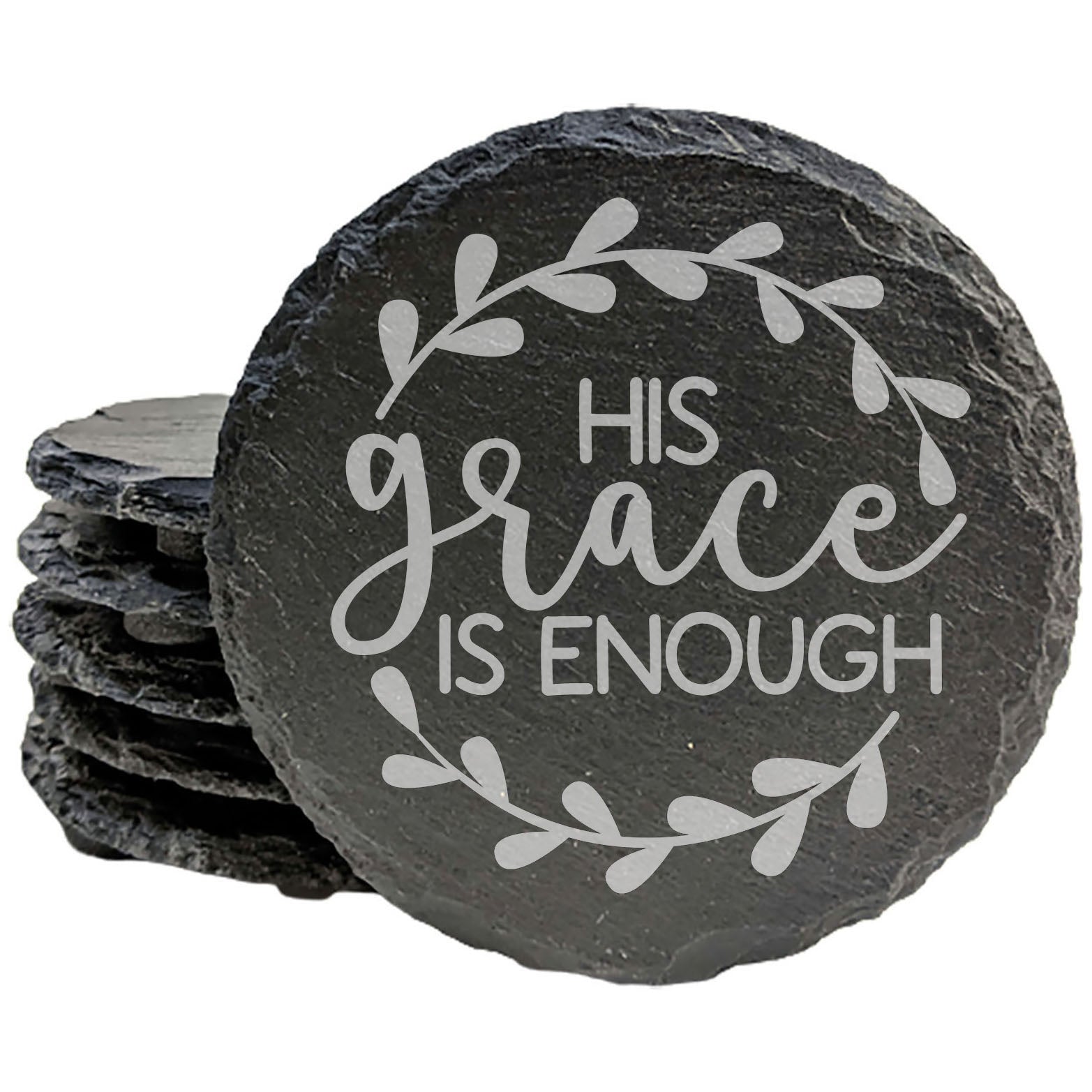 Find encouragement and strength in the timeless message of scripture with these captivating rustic gray slate coasters, featuring the beautiful laser-etched inscription "His grace is enough". This inspirational verse from 2 Corinthians 12:9 offers a gentle reminder of God's ever-present grace and love, providing comfort and hope in challenging times.