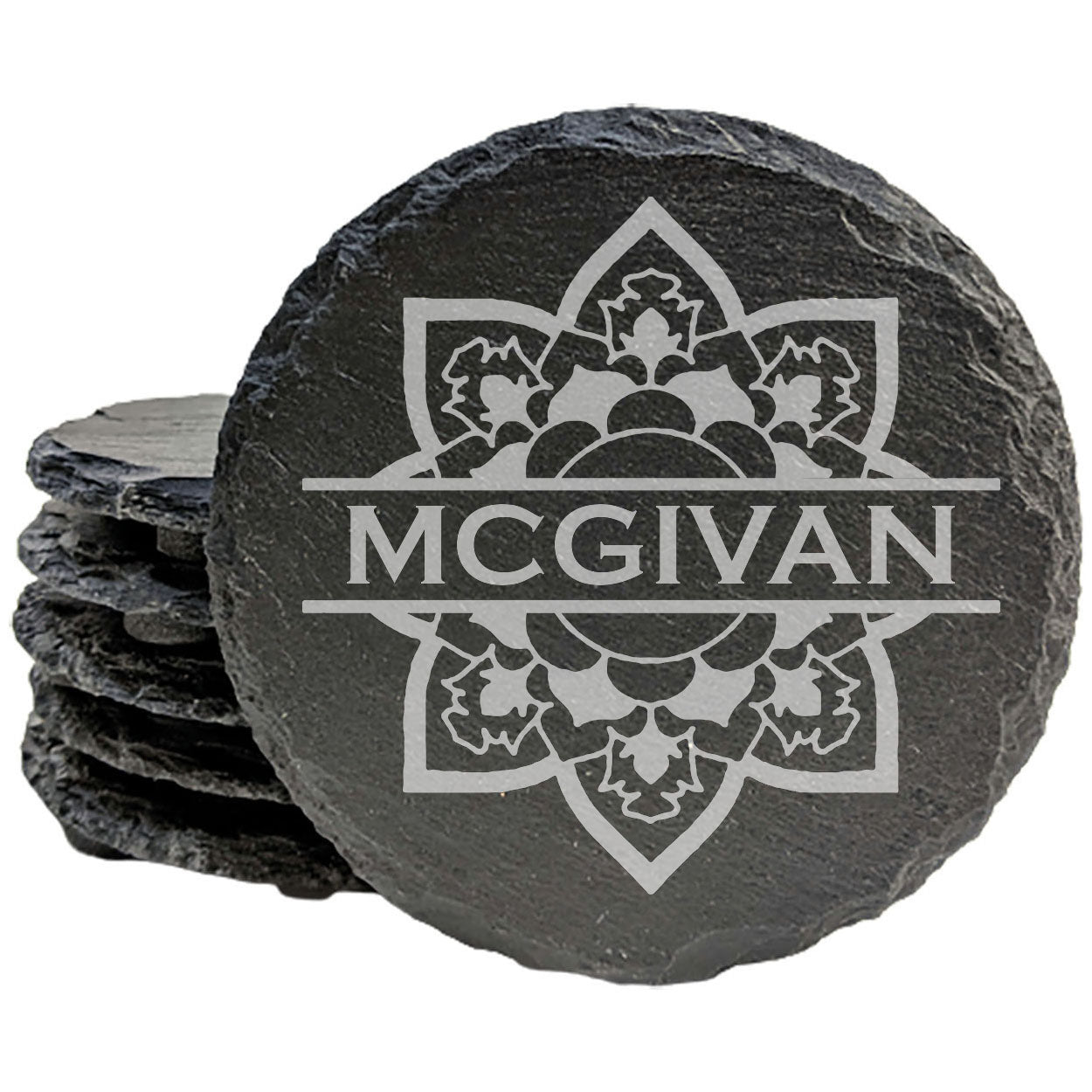 Add a touch of blooming beauty and personalized charm to your home with these unique slate coasters, featuring a laser-etched floral split monogram design!