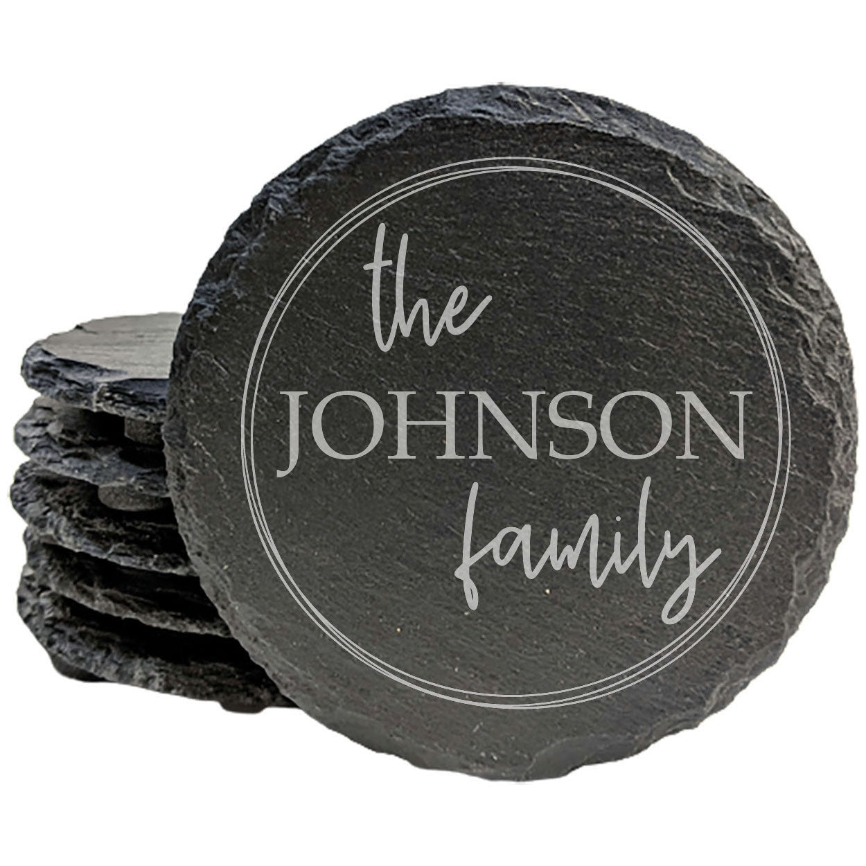 Commemorate life's special moments with these unique slate coasters, featuring a laser-etched round monogram design that you can personalize with your family name.