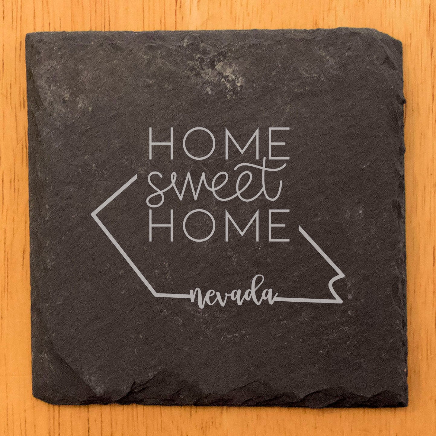 Elevate your home decor with our handcrafted slate coasters, proudly made in Oregon, USA. Each 4-inch round coaster in this set of 4 features a charming laser-etched design showcasing the state of Nevada with 'home sweet home' sentiment - perfect for showing your state pride or gifting to someone special.