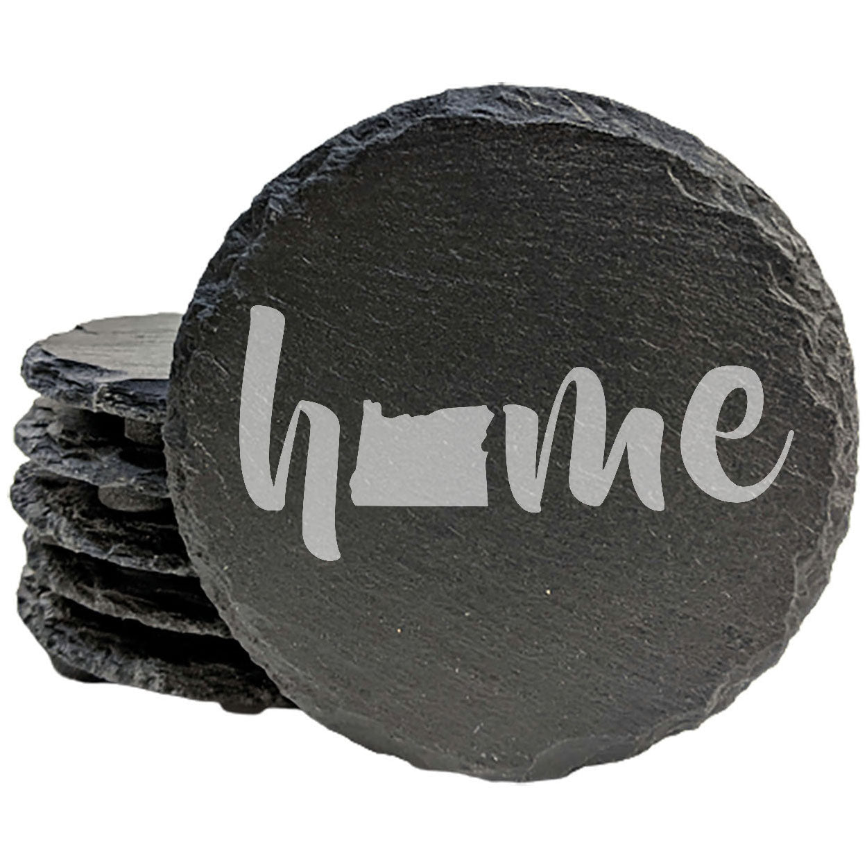 Elevate your home decor with our handcrafted slate coasters, proudly made in Oregon, USA. Each coaster in this set of 4 features a beautifully laser-etched design showcasing the word "home" with Oregon's iconic shape replacing the "O" - perfect for showing your state pride while protecting your furniture.