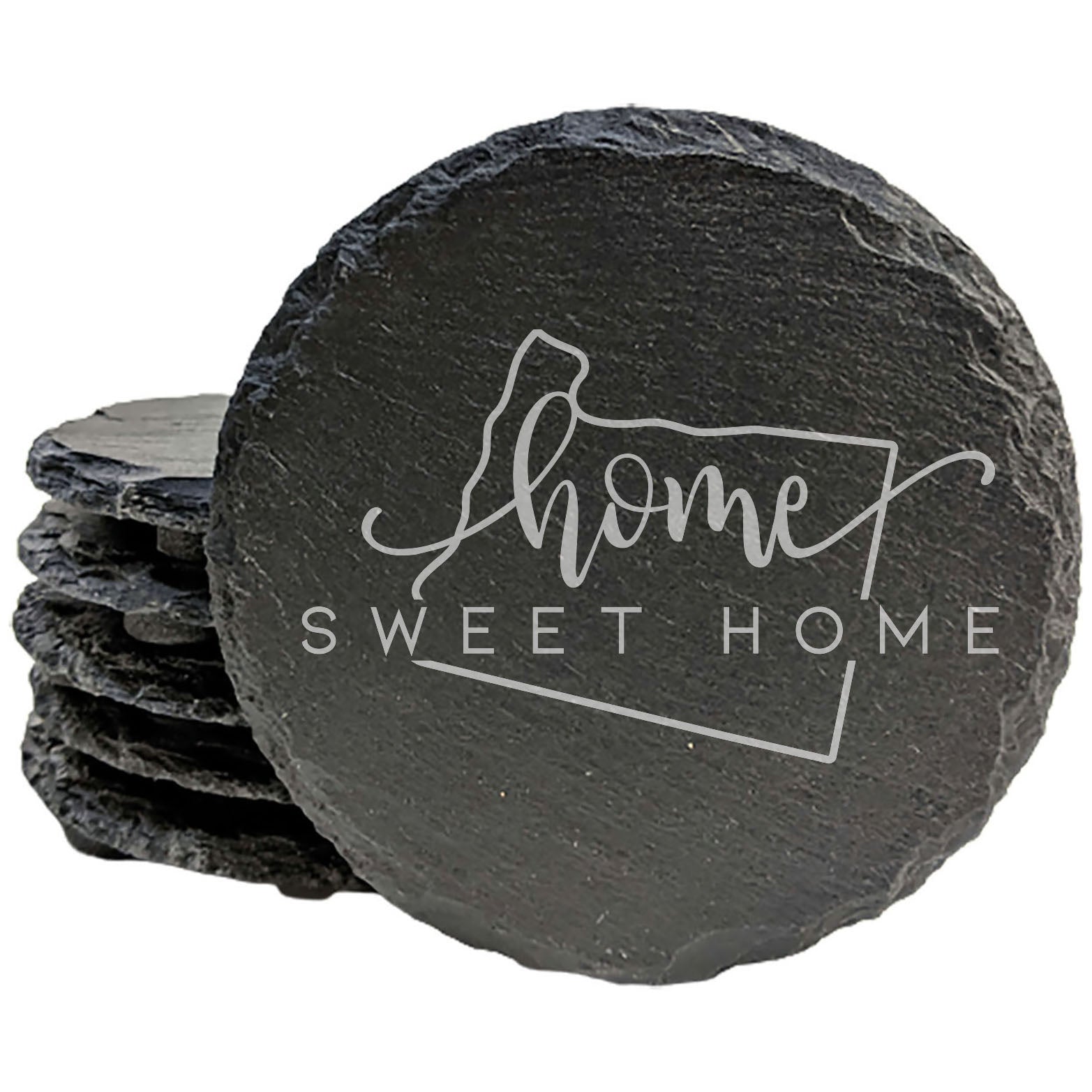 Elevate your home decor with our handcrafted slate coasters, proudly made in Oregon, USA. Each 4-inch round coaster in this set of 4 features a charming laser-etched design showcasing the Oregon state outline with 'home sweet home' text, perfect for showing your state pride or commemorating a special place.