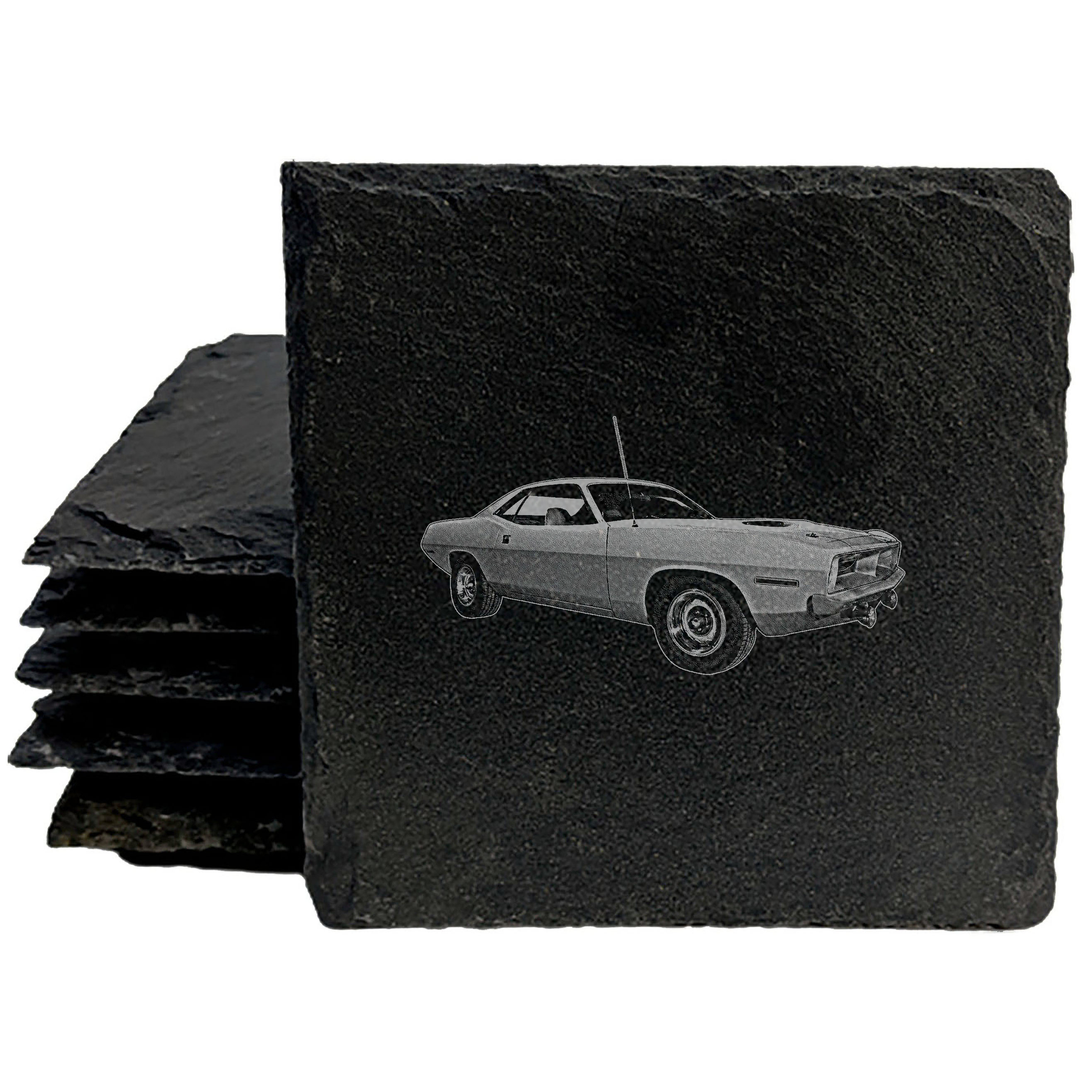 Own a piece of muscle car history with these one-of-a-kind slate coasters, featuring a stunning laser-etched image of a legendary 1970 Plymouth Barracuda.