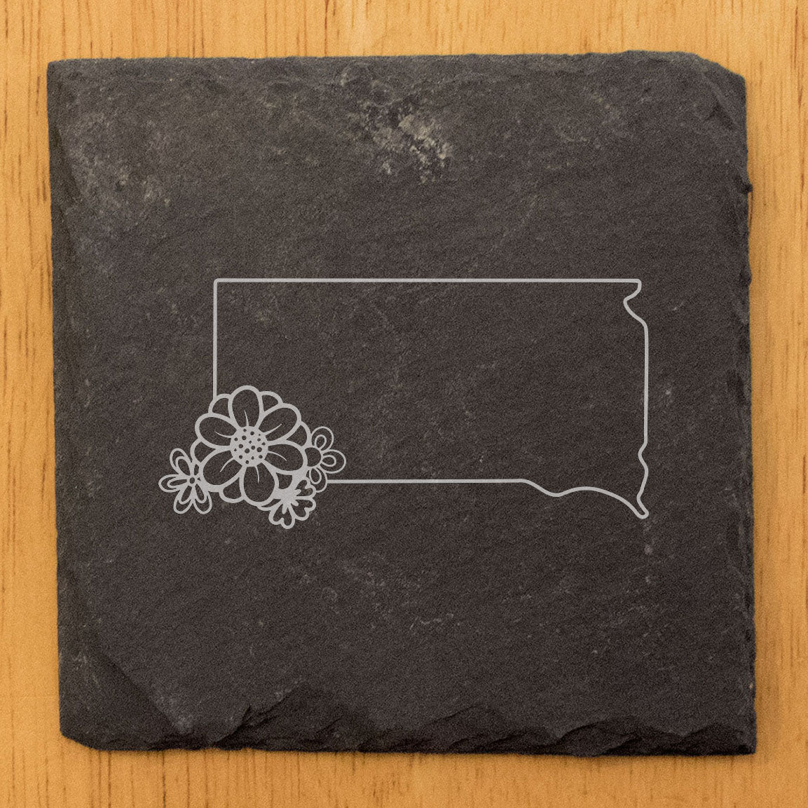 Elevate your home decor with our handcrafted slate coasters, proudly made in Oregon, USA. Each coaster in this set of 4 features a beautifully laser-etched design showcasing the state of South Dakota with an elegant flower accent in the upper right corner. Perfect for protecting your furniture while adding a touch of rustic charm to any room.
