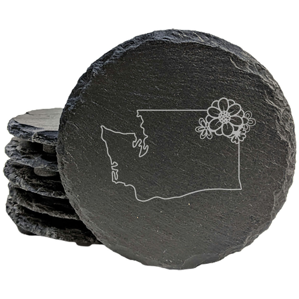 Rustic Slate Coasters Set of 4 - Laser Etched Washington State Design w/ Flower - Perfect Gift for Holidays, Birthdays, Housewarming - 4" Round/Square - Made in Oregon, USA - Natural Edge