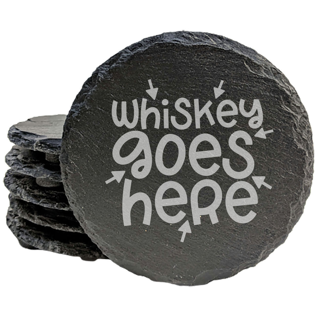 Raise a glass and add a touch of humor to your whiskey ritual with these unique and hilarious slate coasters, featuring the inscription "Whiskey Goes Here" - a clear and concise message for any true whiskey enthusiast.