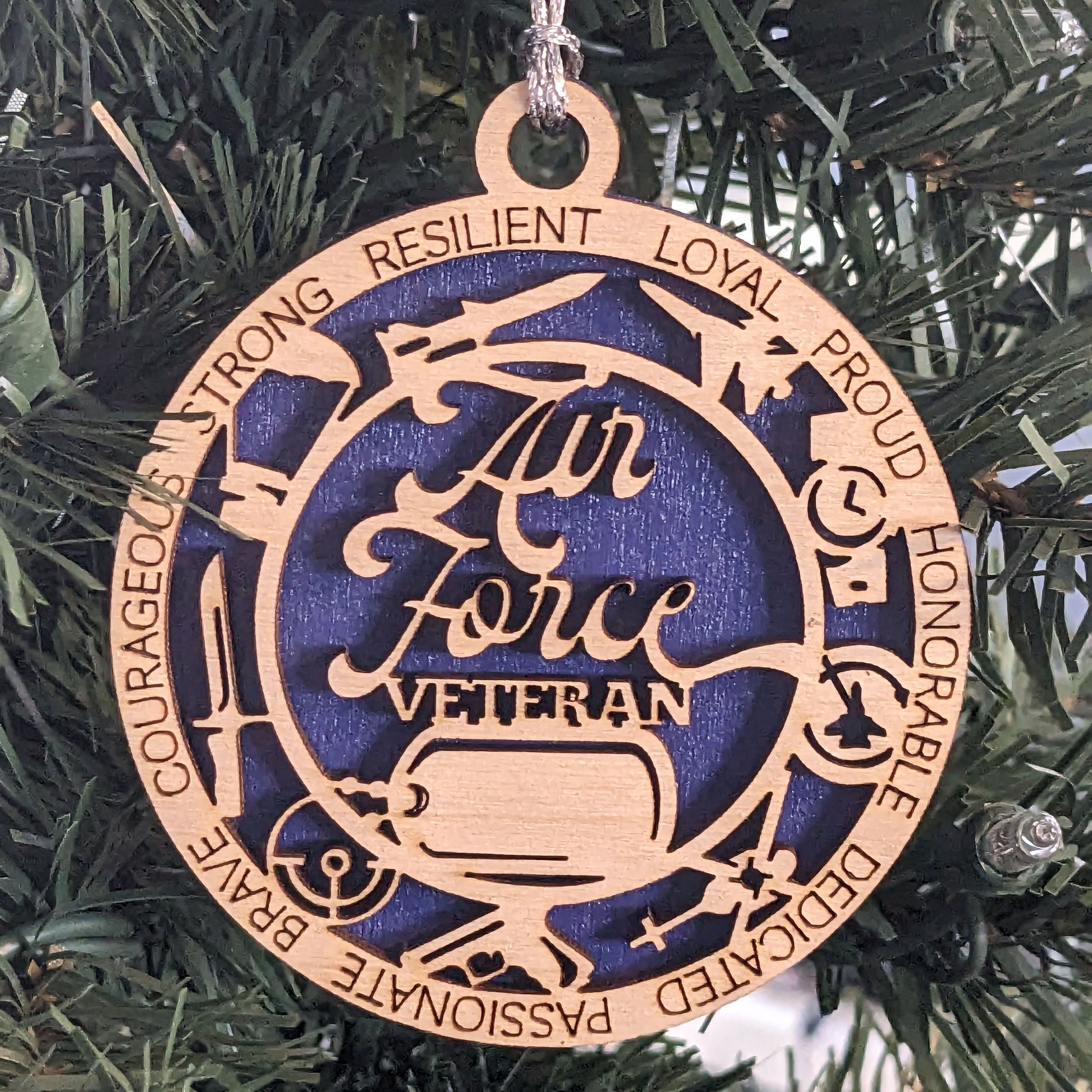 Honor U.S. Air Force members with this 3" round laser-cut wooden Christmas ornament. Handmade in Oregon, USA, by a small business, this two-layer ornament pays tribute to Air Force veterans and active service members.