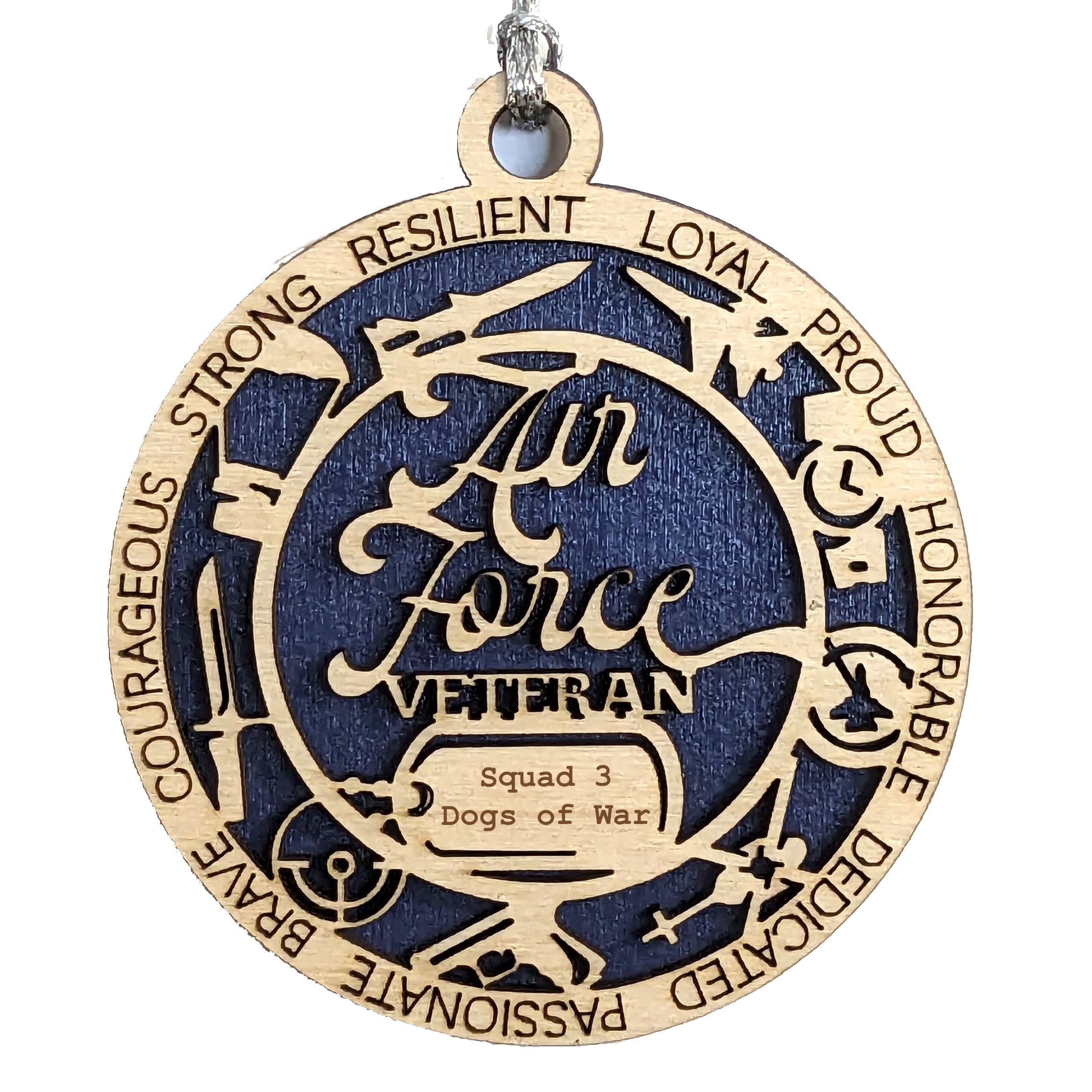 Patriotic Air Force Veteran Keepsake - 3" Laser Engraved Wood Ornament with Personalized Dogtags - Holiday Decor