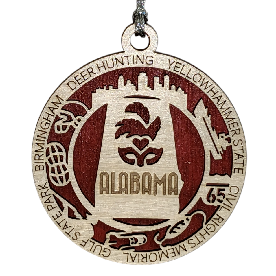 Alabama State Pride 3D Wood Laser Cut Ornament: Featuring Iconic Alabama Symbols and Custom Background Colors