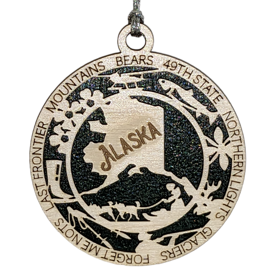 Alaska State Pride 3D Wood Laser Cut Ornament: Featuring Iconic Alaska Symbols and Custom Background Colors