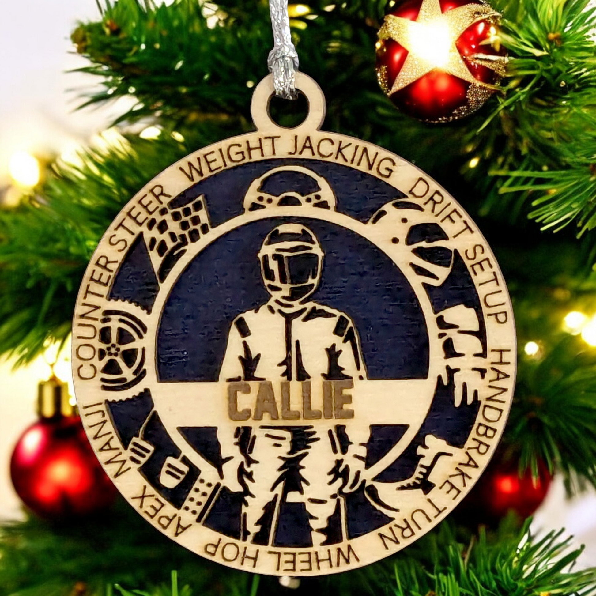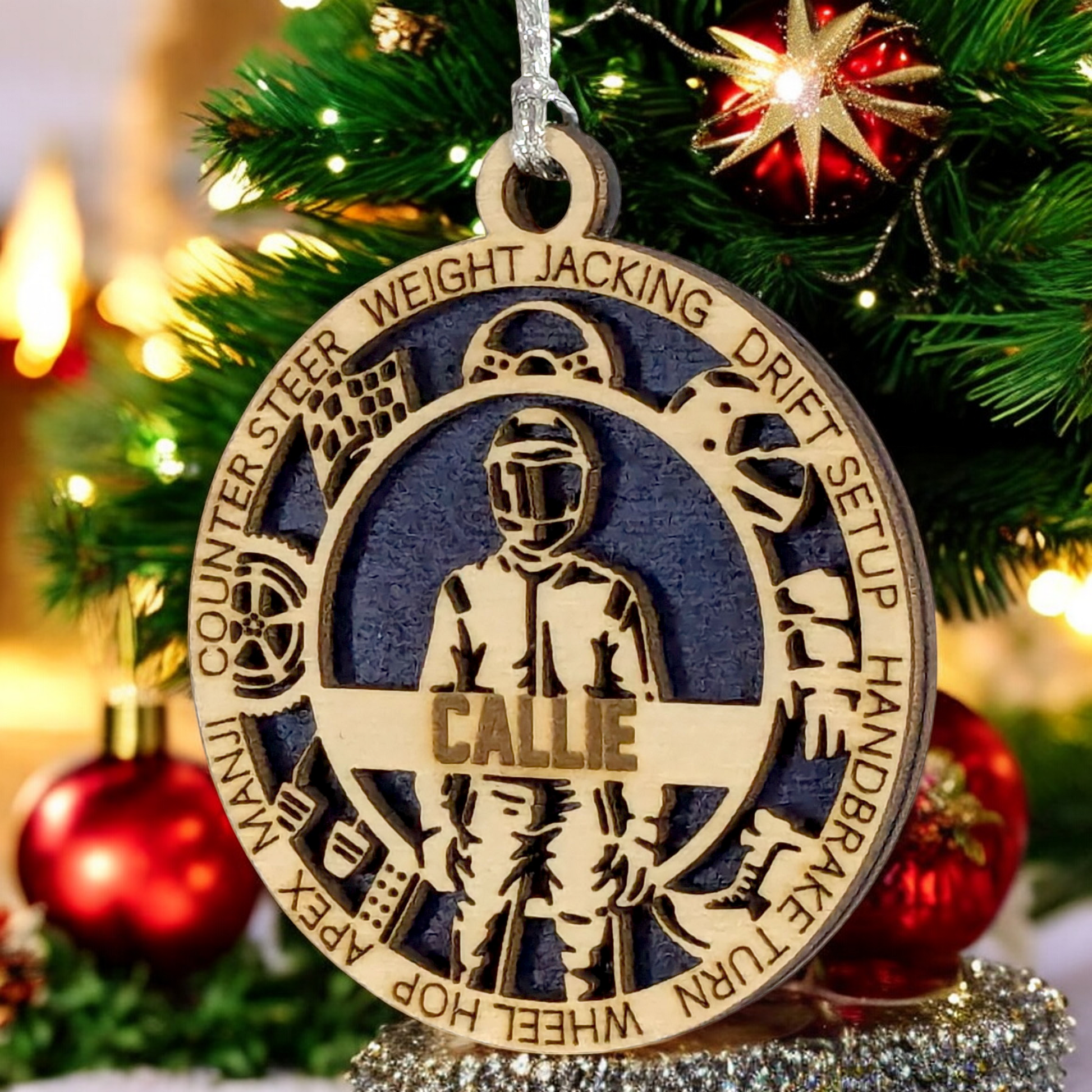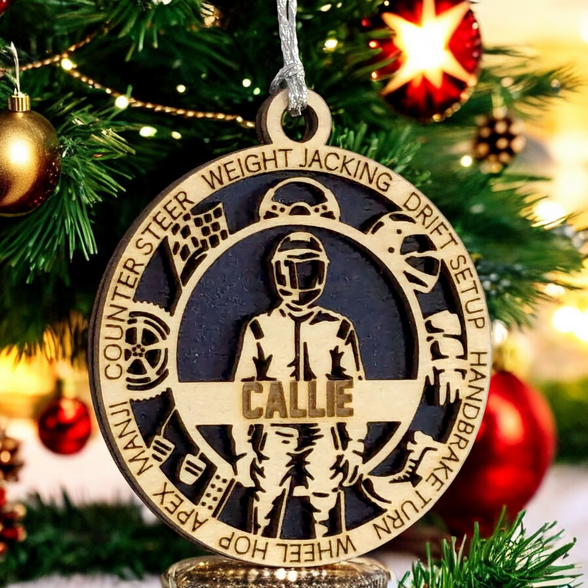Personalized 3-Inch Handcrafted Wooden Car Racing Christmas Ornament - Unique Laser Cut Design - Customizable Holiday Decor for Racing Enthusiasts - Festive Keepsake for Car Lovers and Motorsport Fans