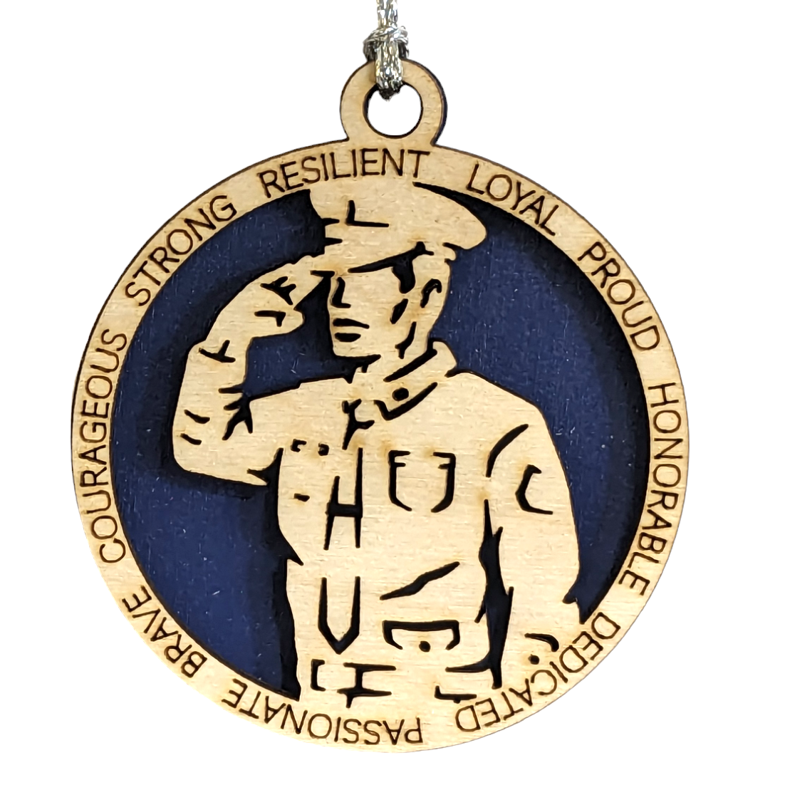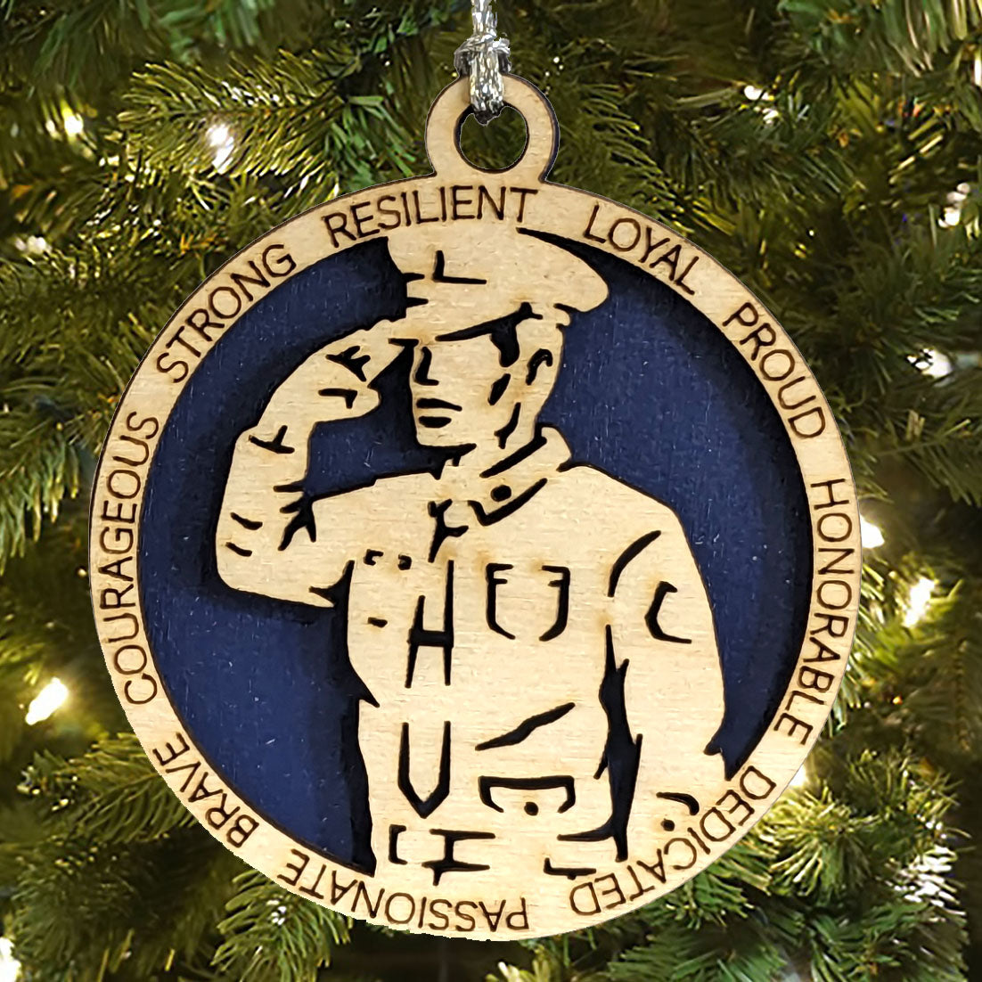 This ornament is a tribute to the dedication of men serving in the Coast Guard. The centerpiece shows a male sailor in formal uniform, representing pride and professionalism. Precision laser-cutting ensures crisp details, showcasing American craftsmanship.