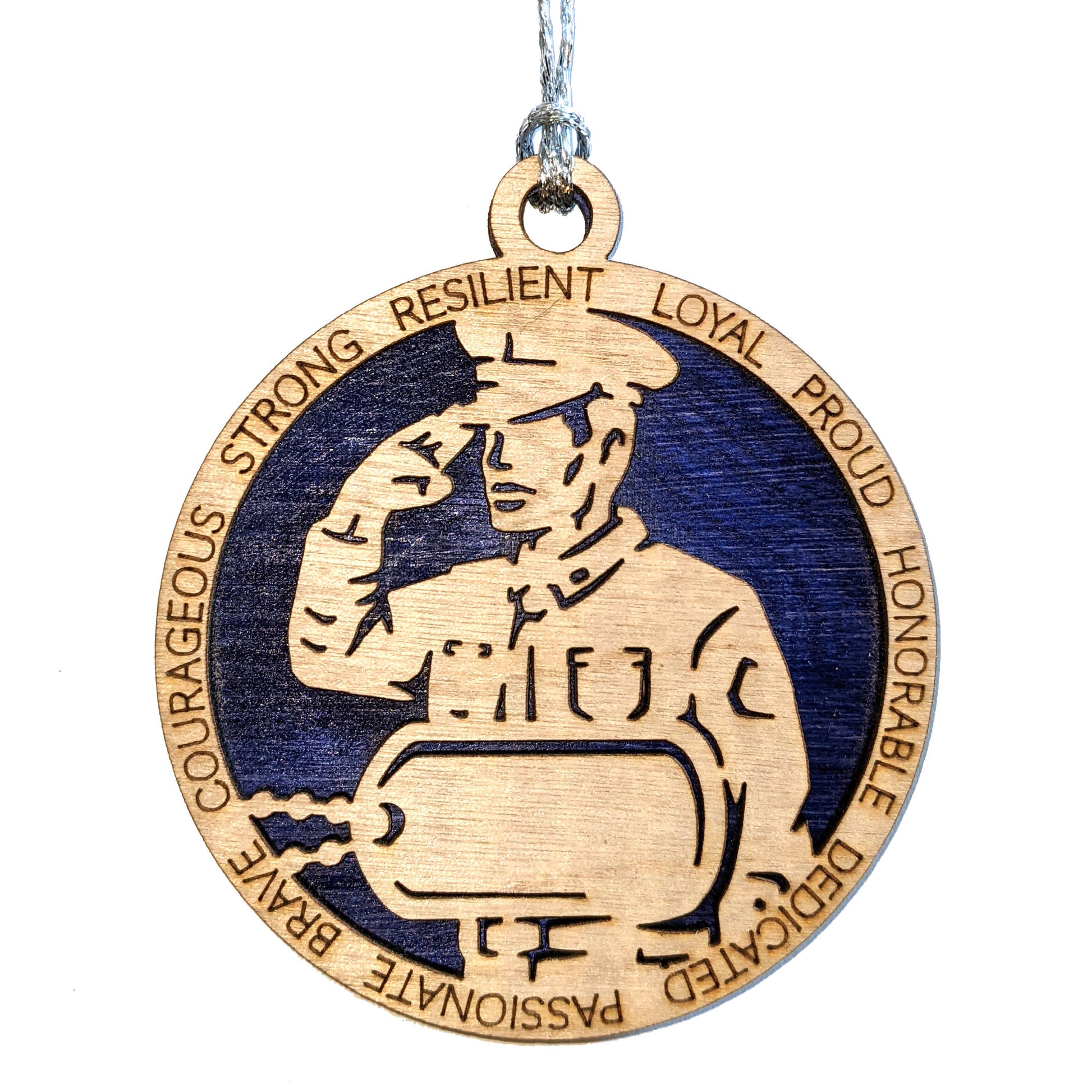 Honor brave men of the US Coast Guard with this 3-inch round, laser-cut wooden Christmas ornament. Handcrafted by a small business in Oregon, USA, this two-layer ornament features a male Coast Guard sailor in formal dress uniform.