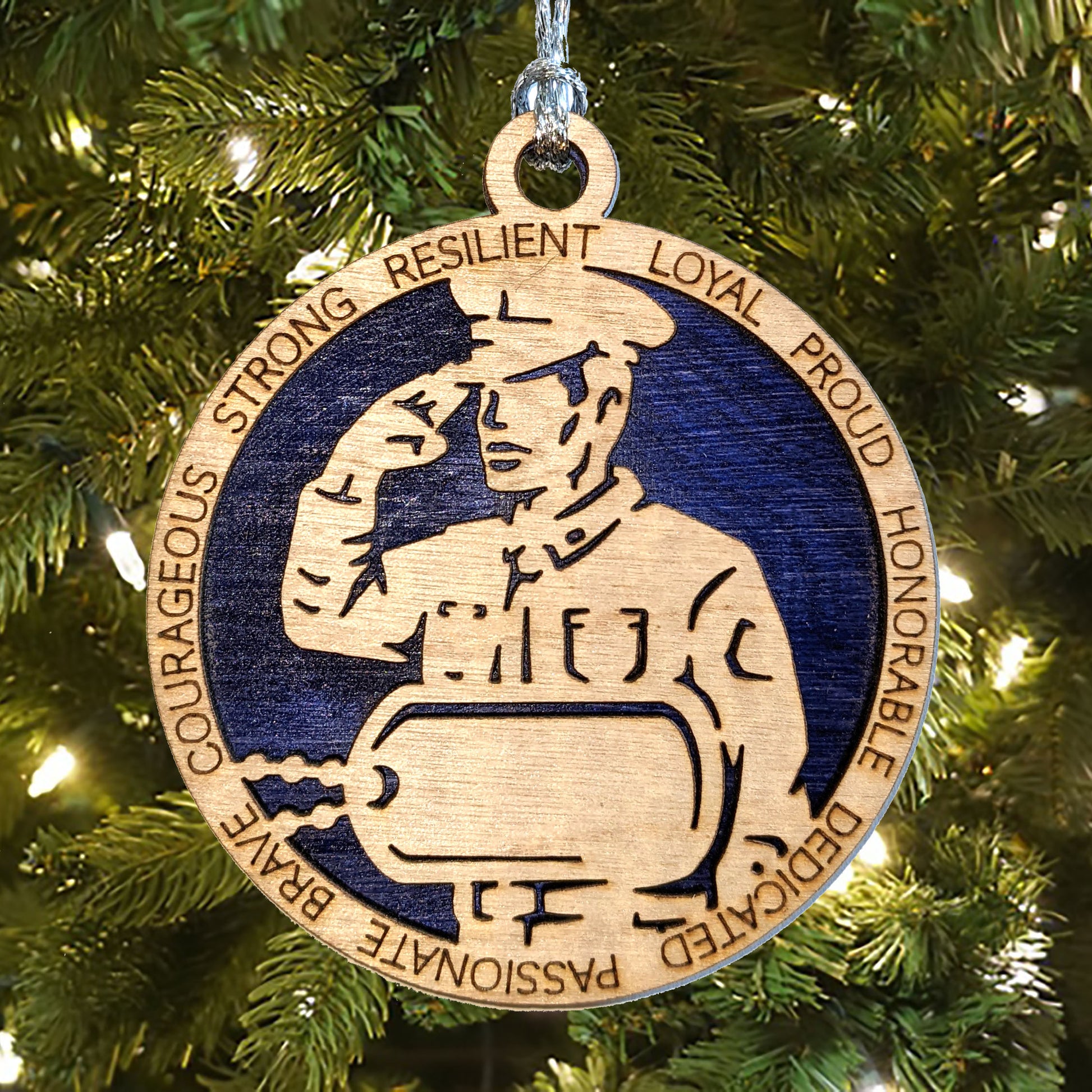 To personalize, provide text for dog tags and select back layer color during checkout. Order now to add patriotism and gratitude to your holiday celebrations, honoring men's military service with this unique, handmade wooden ornament.