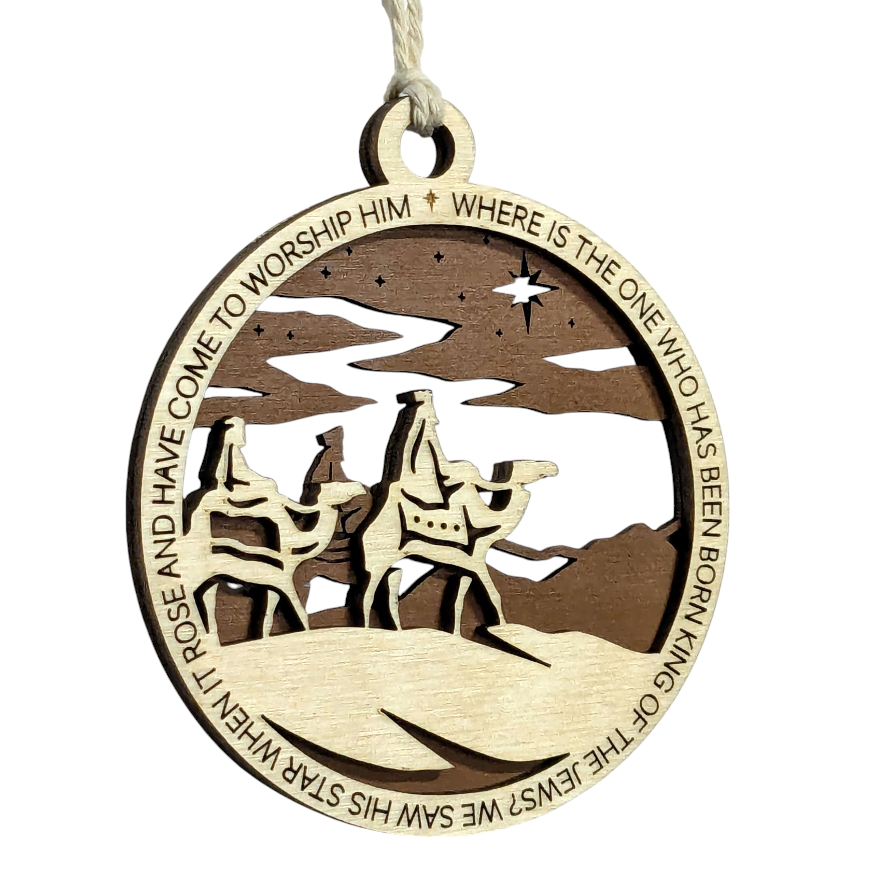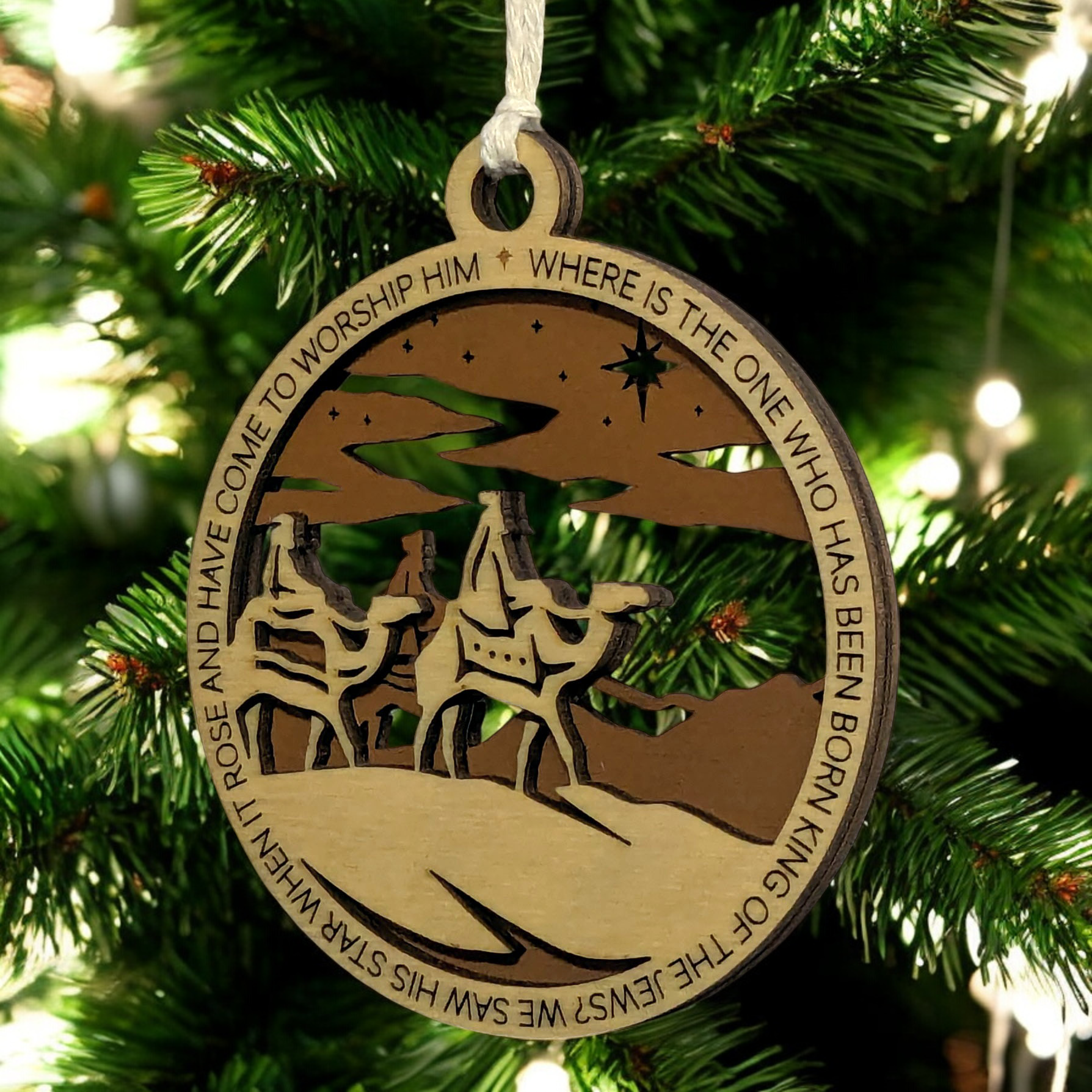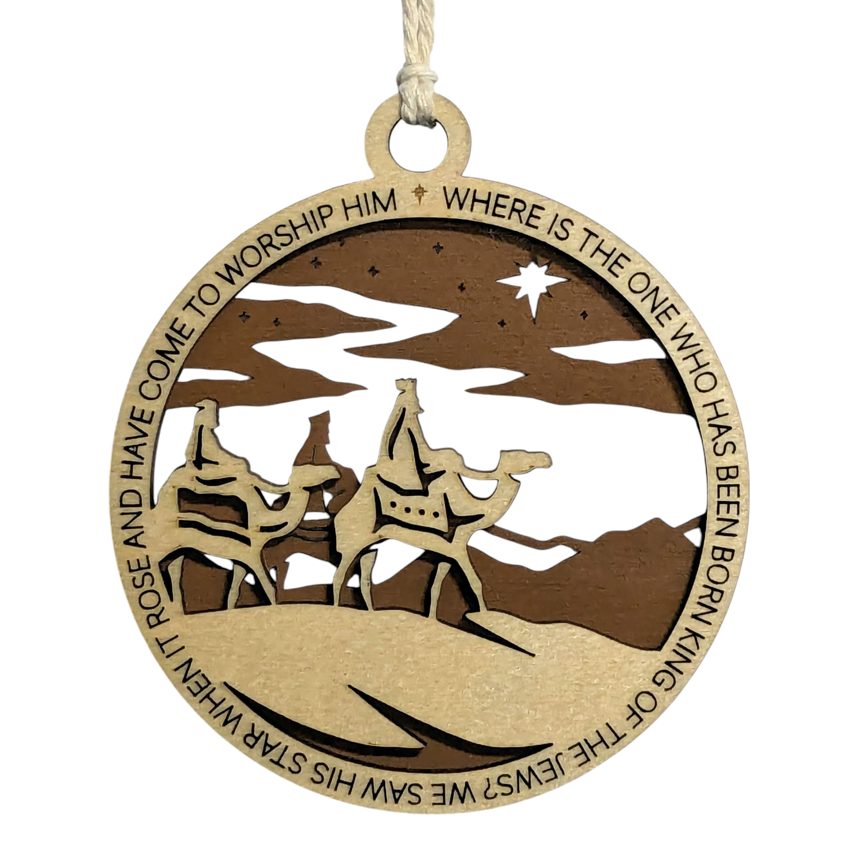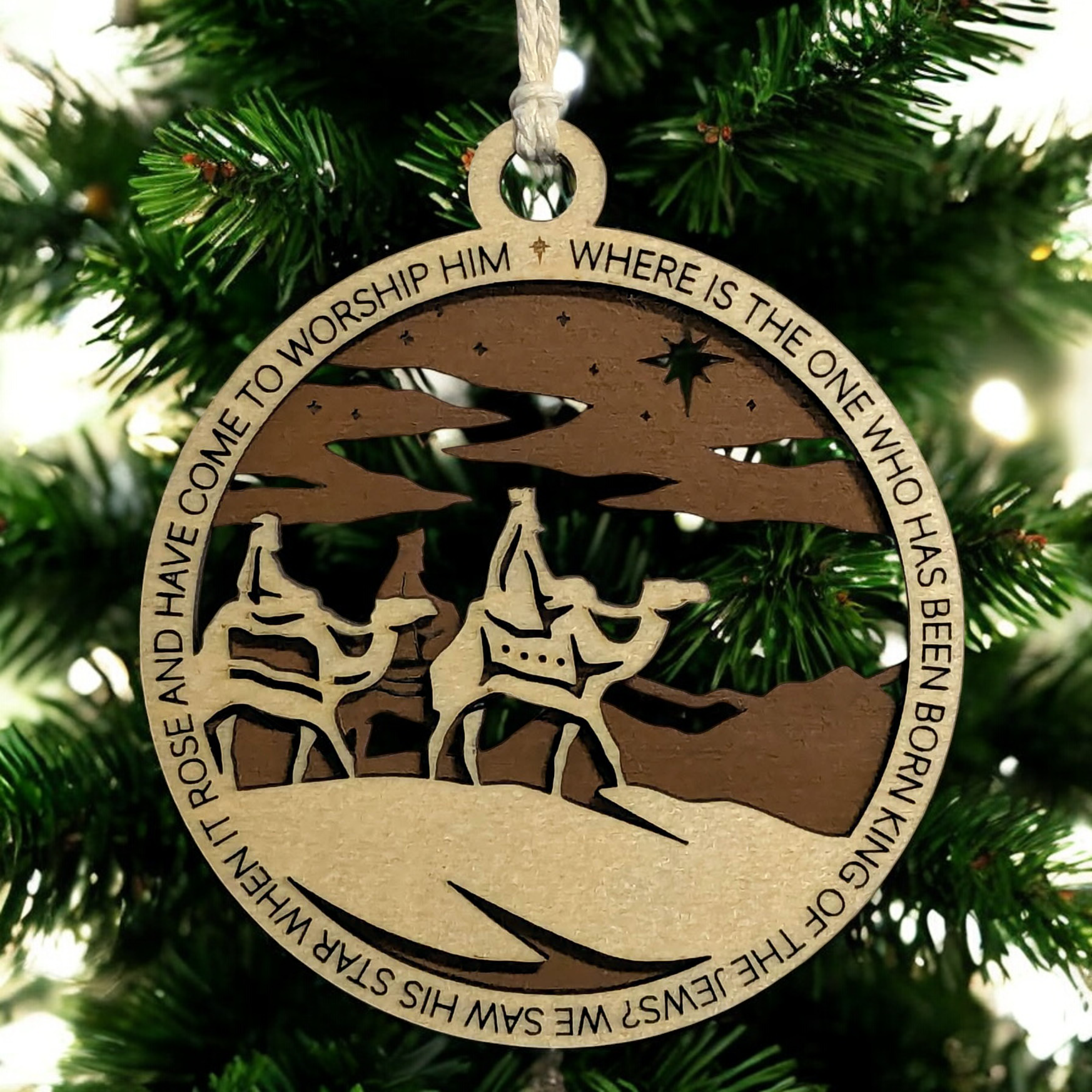 Handcrafted 3.5" Round Wooden Christmas Ornament, 2-Layer Laser Cut Design, Natural & Stained Wood, Featuring Matthew 2:2 Bible Verse & Wise Men Scene, Made in USA, Perfect Holiday Decor Gift