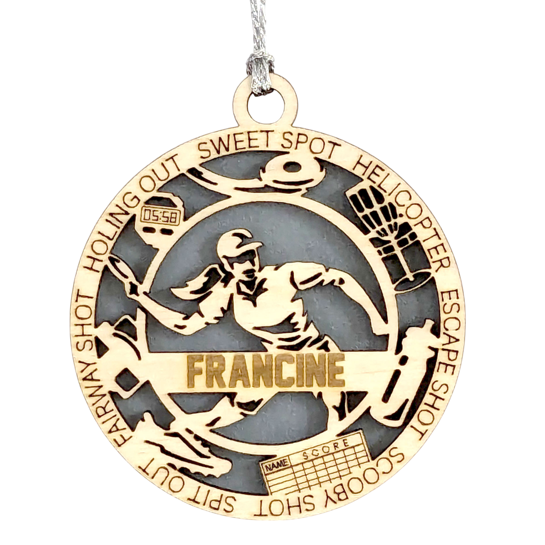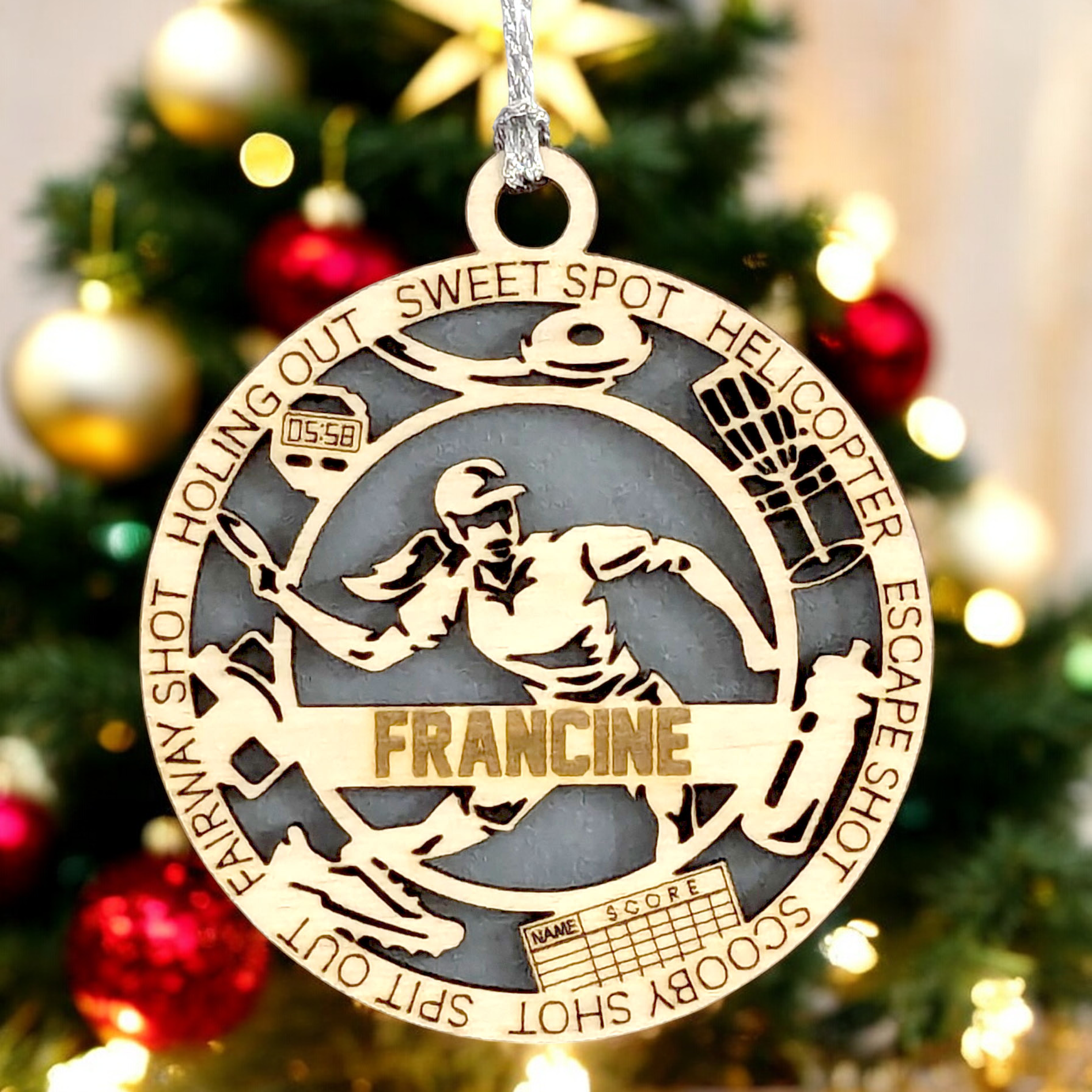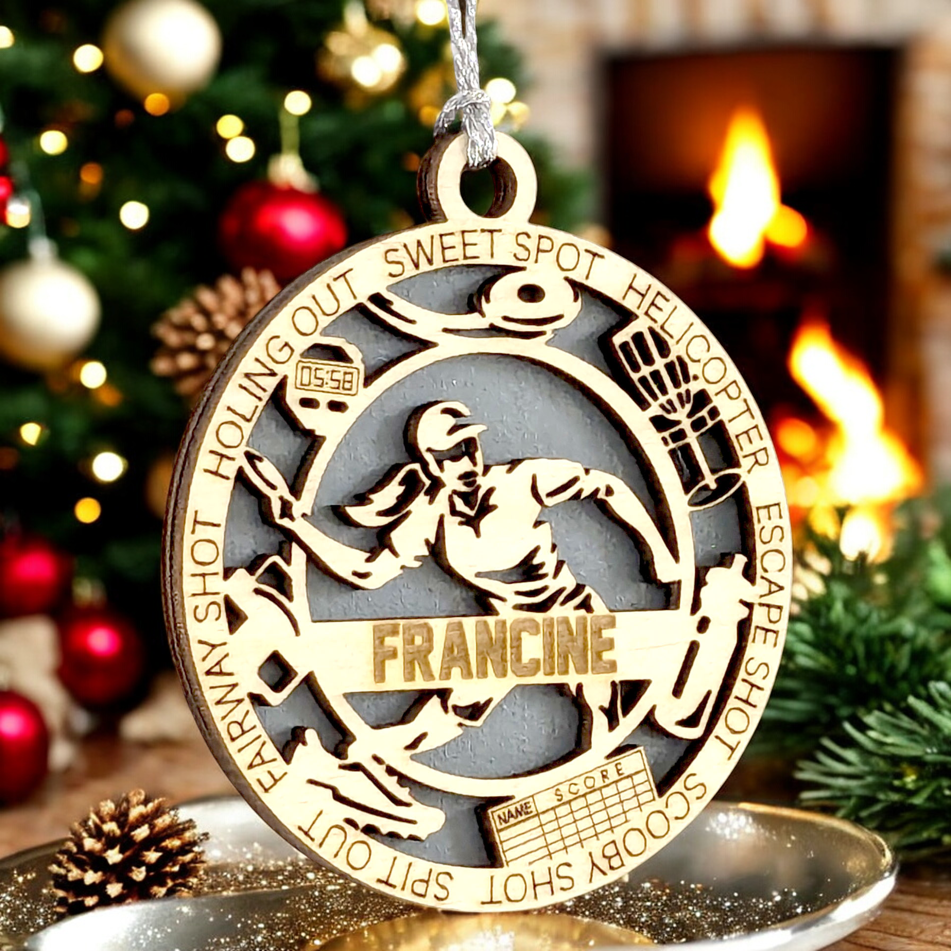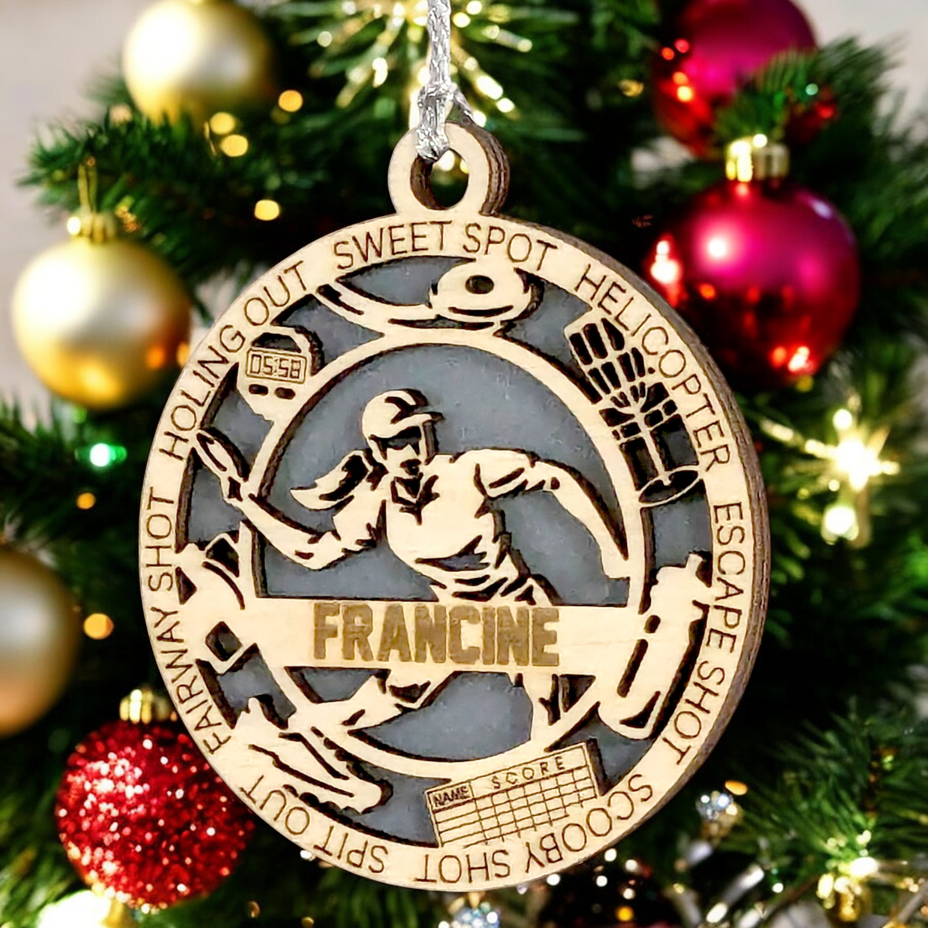3" Handcrafted Wooden Personalized Female Right-Handed Disc Golf Christmas Ornament - Custom Disc Golf Holiday Decoration