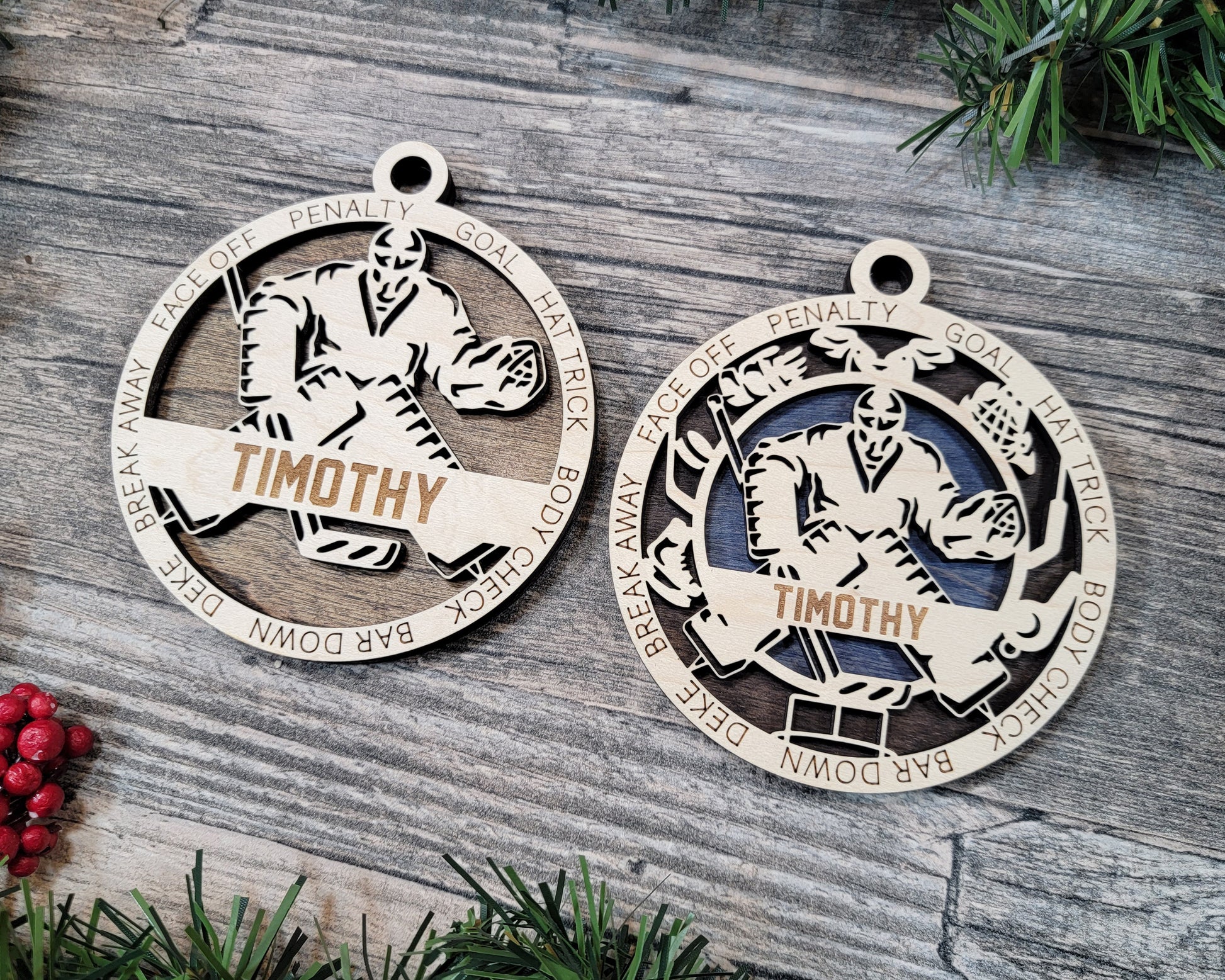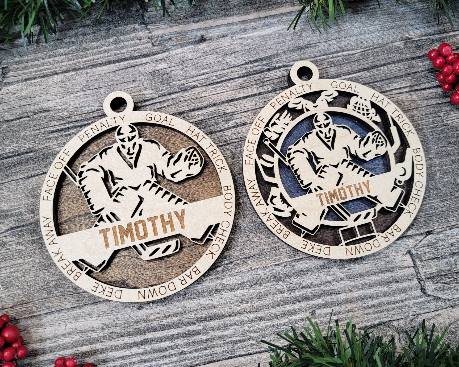 Laser cut wooden ornament to celebrate the hockey player in your life.