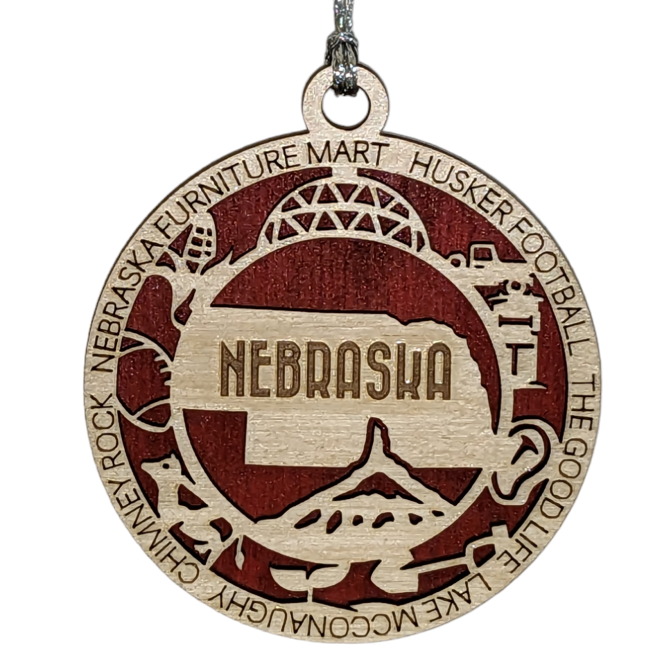 Nebraska State Pride 3D Wood Laser Cut Ornament: Featuring Iconic Nebraska Symbols and Custom Background Colors