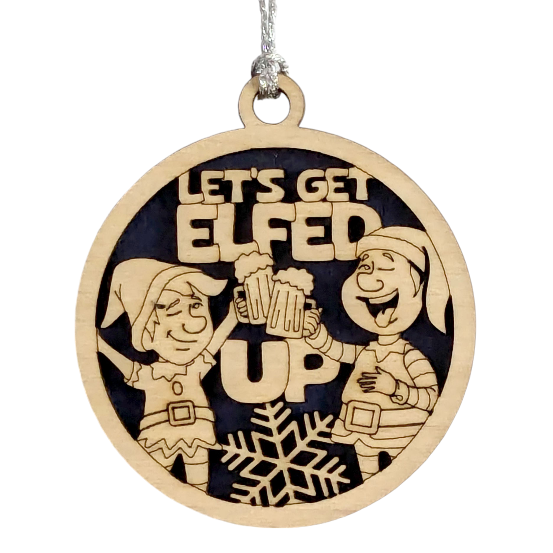 This unique ornament is sure to be a conversation starter at your next holiday gathering. The intricate laser-cut design showcases two jolly elves raising their mugs, accompanied by the cheeky phrase "Let's Get Elfed Up." The natural wood top layer contrasts beautifully with the painted wood backing, creating a striking visual effect that stands out on any Christmas tree.