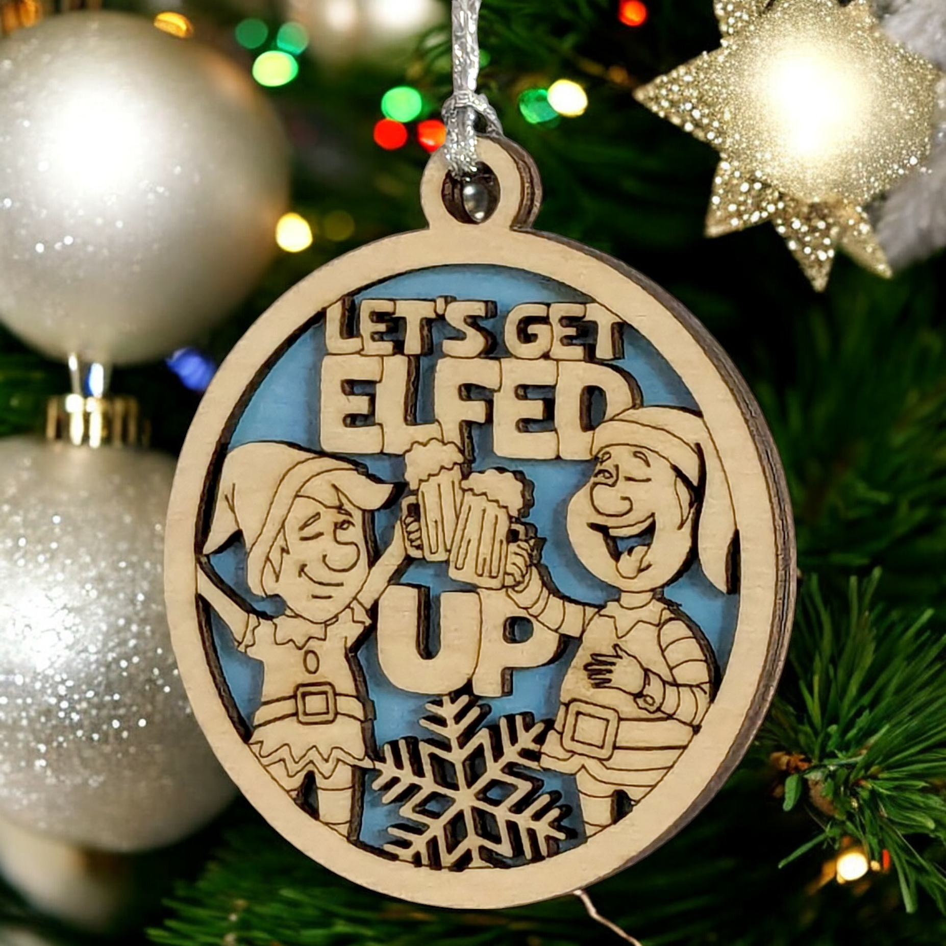 "Let's Get Elfed Up" Lewd Christmas Ornament - 3" Wood Laser Cut, Handcrafted USA, Funny Elf Design