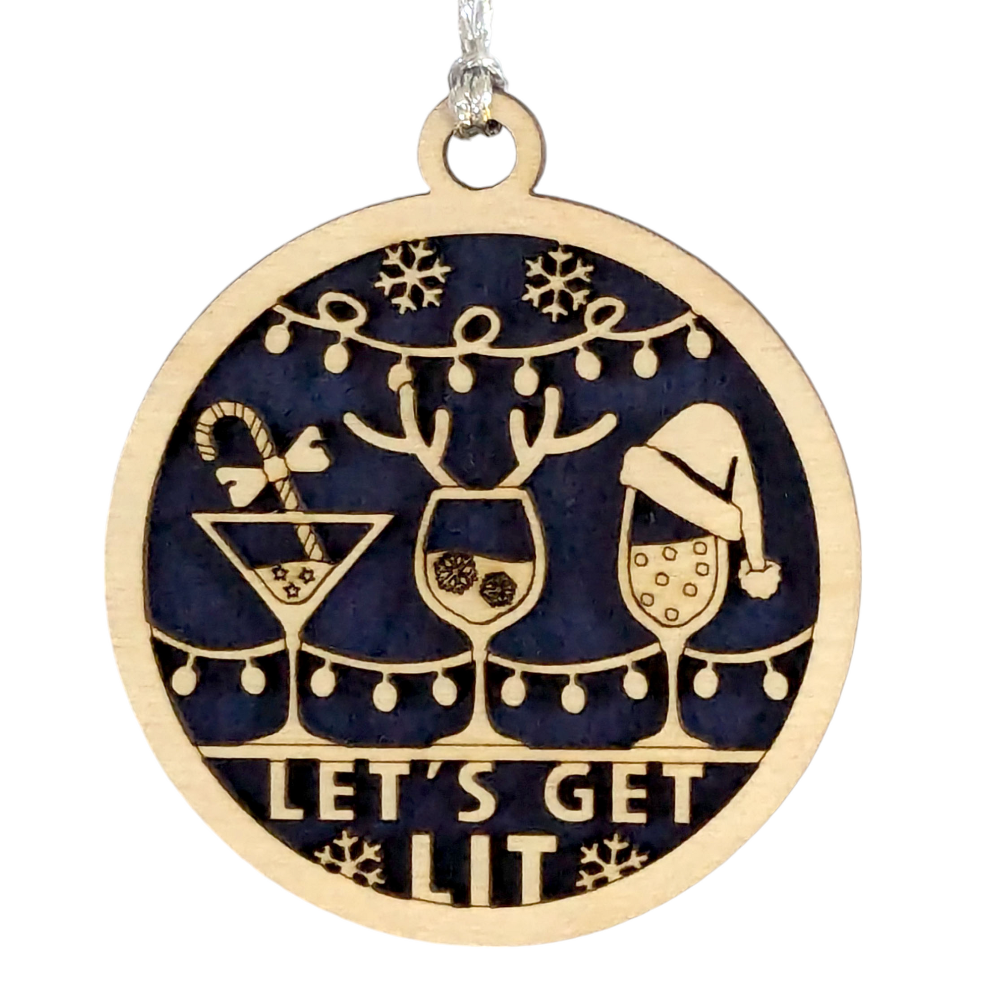 Add a touch of cheeky humor to your Christmas tree with this handcrafted 3" round wooden ornament. Featuring the playful phrase "Let's Get Lit" alongside festive snowflakes, twinkling Christmas lights, and a trio of cocktail glasses, this ornament is perfect for those who like to keep things merry and bright during the holiday season.