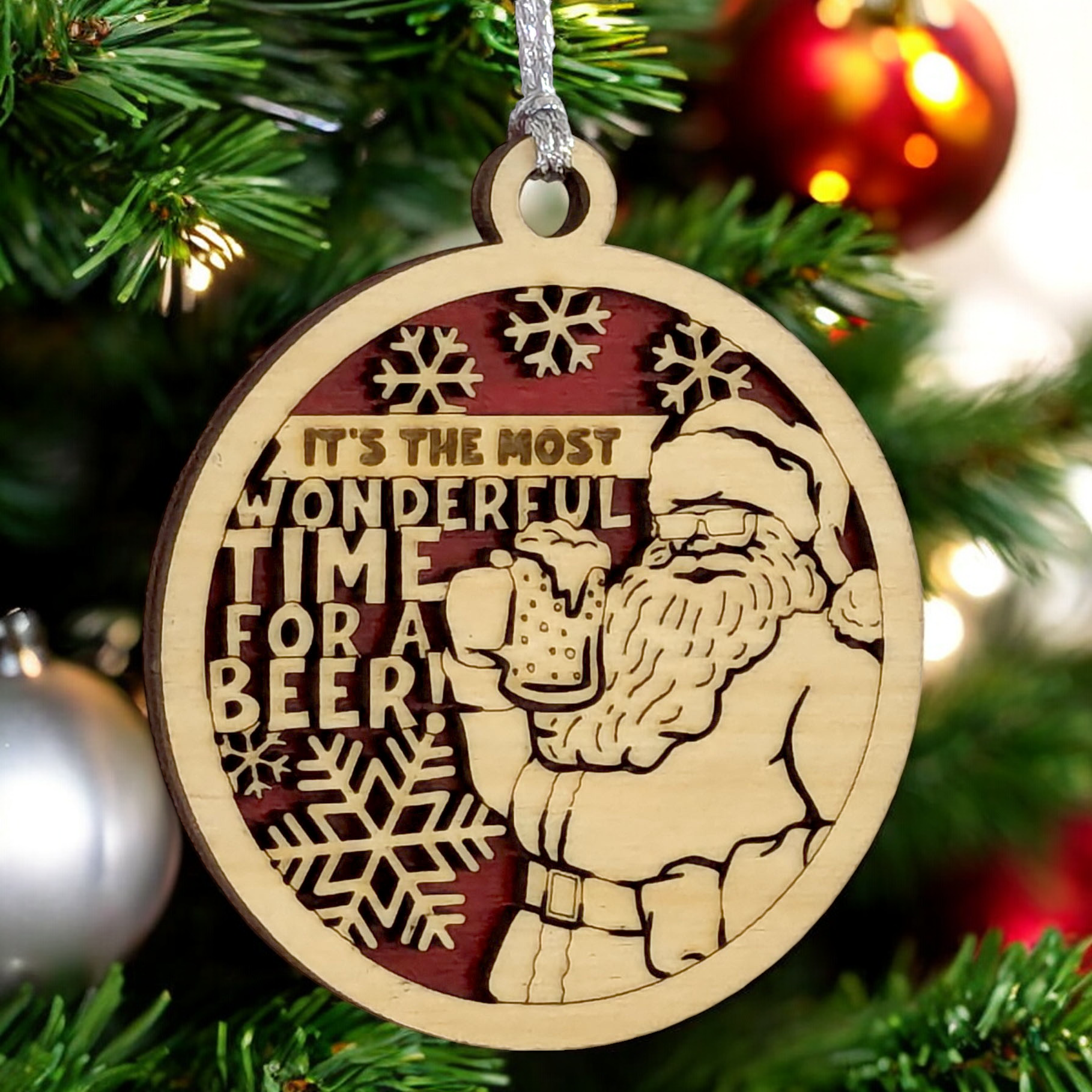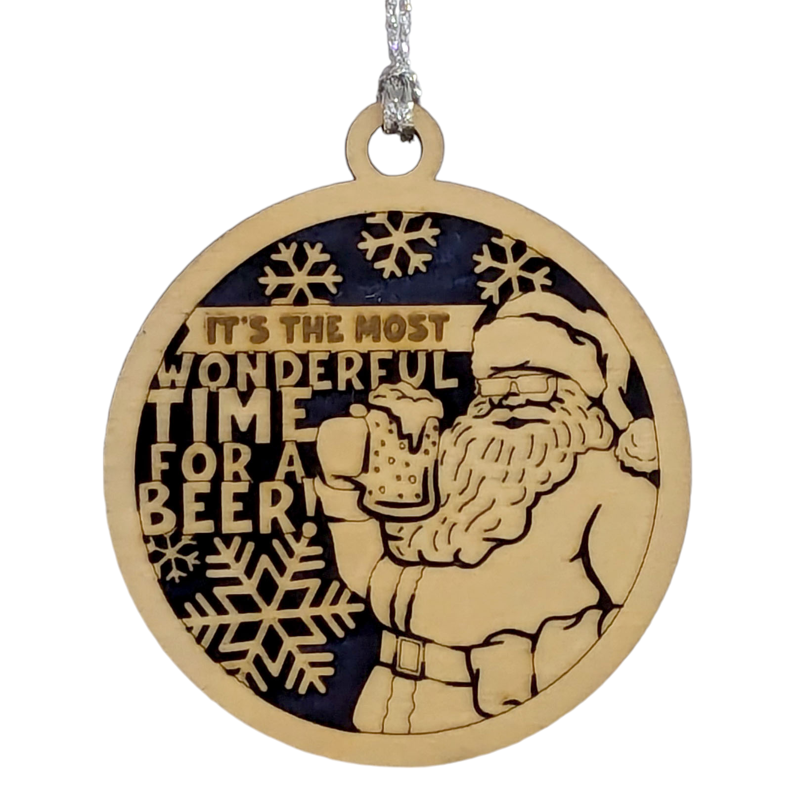 Spread some holiday cheer with a dash of naughty humor using our hilarious "It's the most wonderful time for a beer" Santa Christmas ornament! This unique, handcrafted decoration is perfect for those who like to keep things fun and a little inappropriate during the festive season.