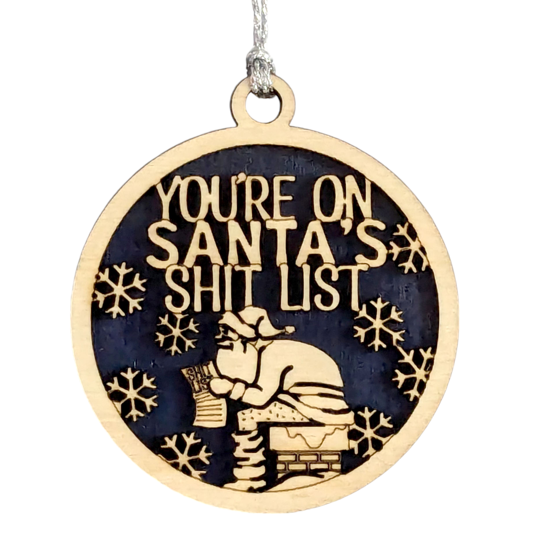 Add a touch of naughty humor to your Christmas tree with this unique, handcrafted wood ornament featuring Santa in a compromising position! This 3-inch round, two-layer ornament showcases a hilariously inappropriate scene of Santa Claus checking his list while pooping down a chimney, accompanied by the cheeky phrase "You're on Santa's Shit List."