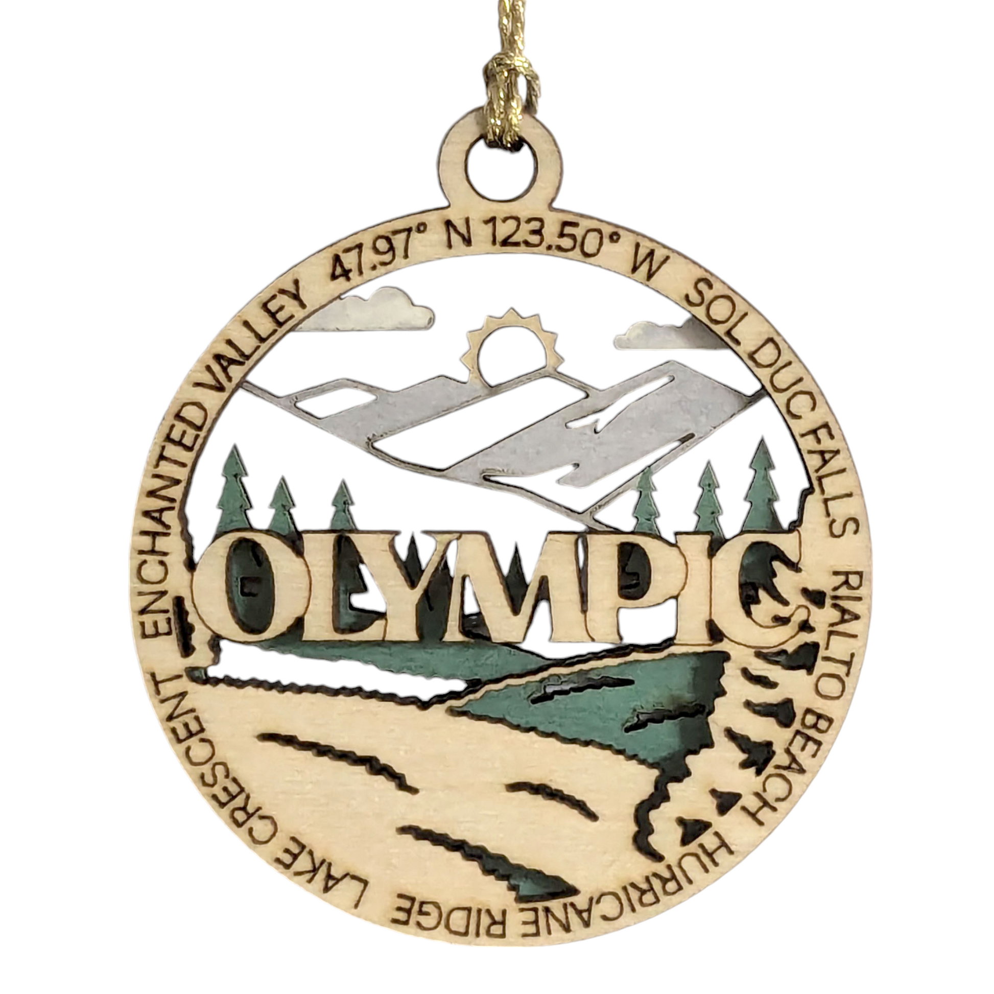 Bring Olympic National Park's beauty into your home with this 3-inch round, laser-cut wooden Christmas ornament. Handcrafted by a small Oregon business, this two-layer masterpiece captures the essence of one of America's most diverse national parks.