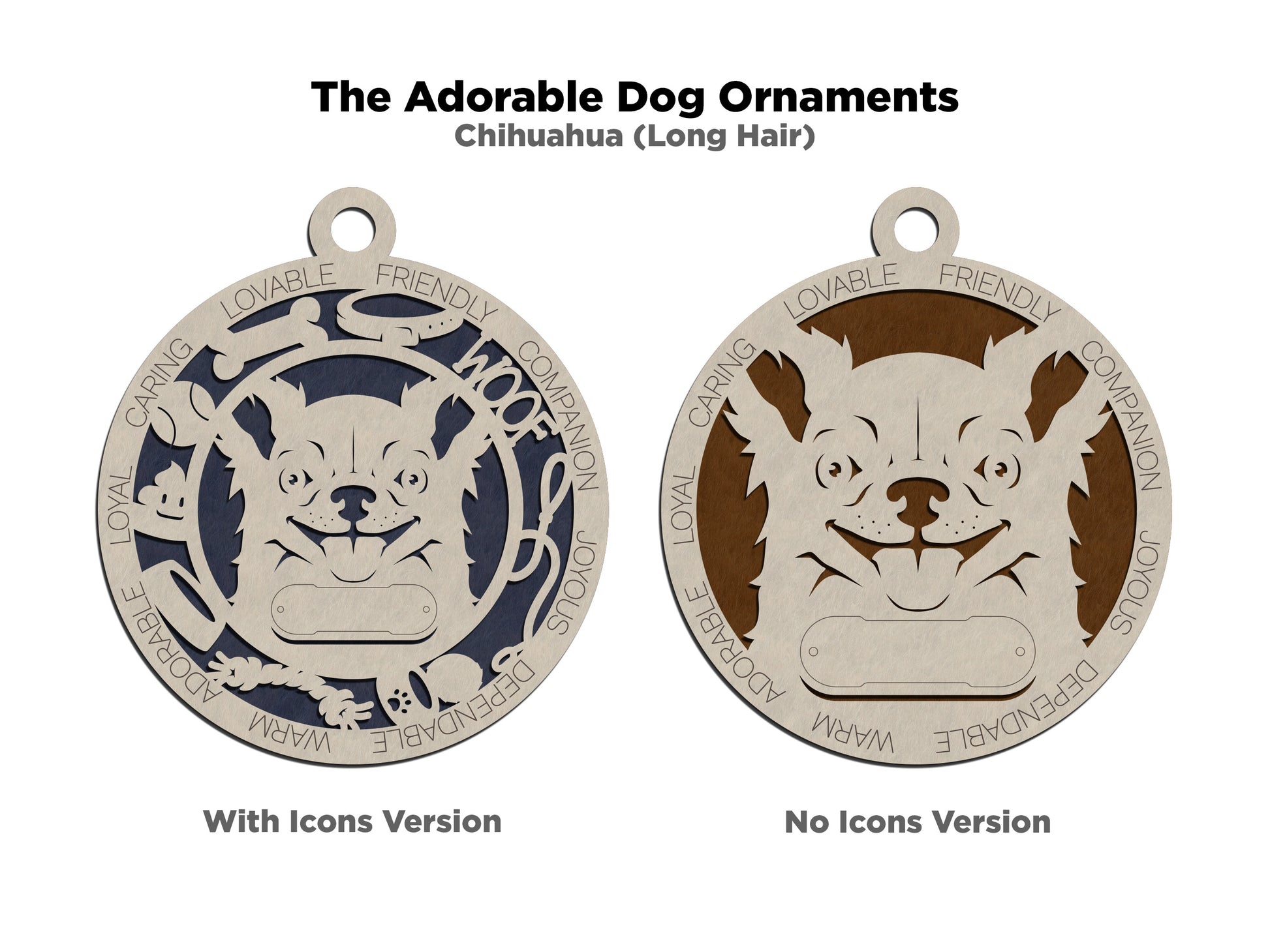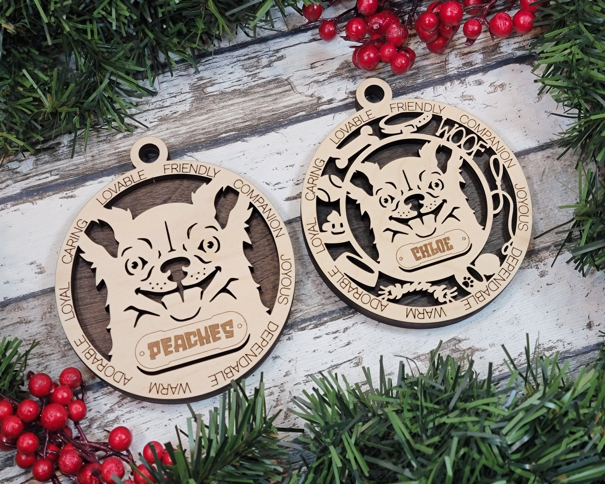 Personalized Long Hair Chihuahua Dog Christmas Ornament, 3" Round, 2-Layer Laser Cut Wood, Customizable Name Tag & Text, Handcrafted in USA, Choose Background Color or Print, Perfect Gift!