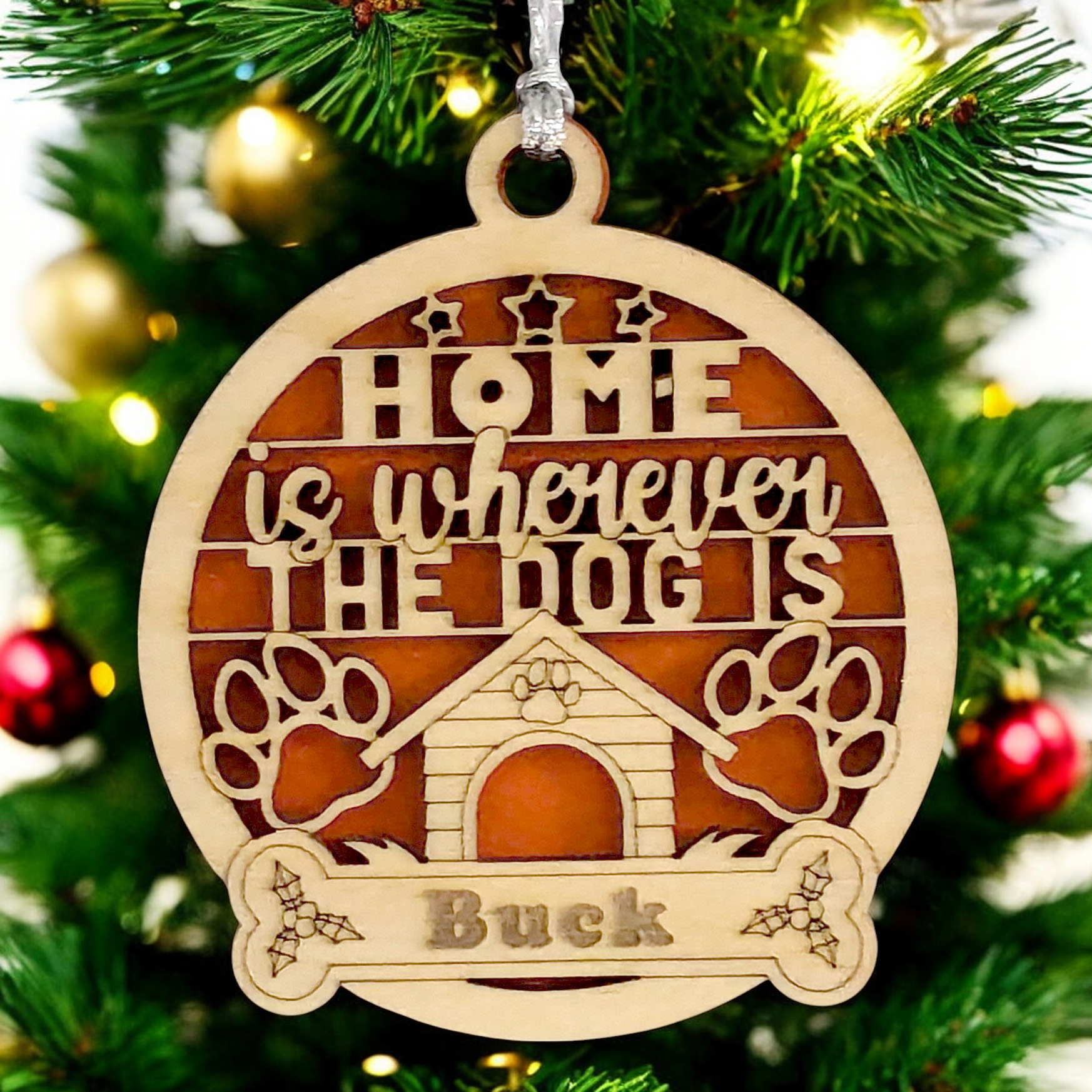 Celebrate your furry family member with this charming handcrafted dog house Christmas ornament, lovingly made in Oregon, USA. Each 3-inch round ornament features a beautifully detailed laser-cut design showcasing a cozy dog house with the heartwarming message "Home is Wherever the Dog is" - the perfect sentiment for any dog lover's holiday decor.