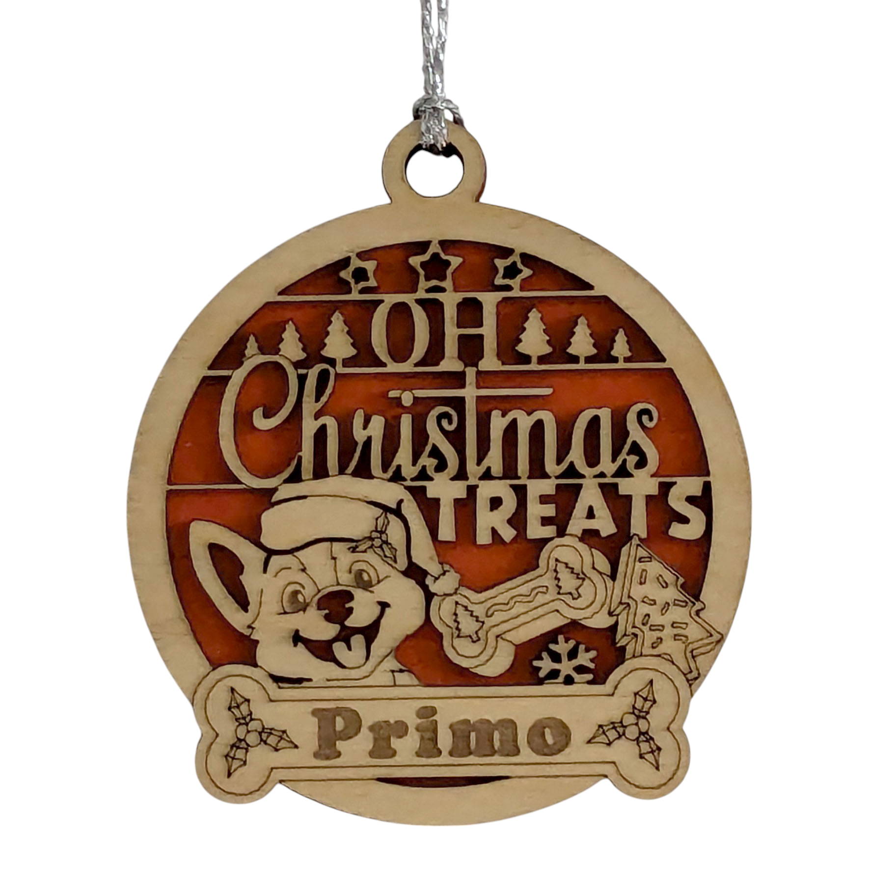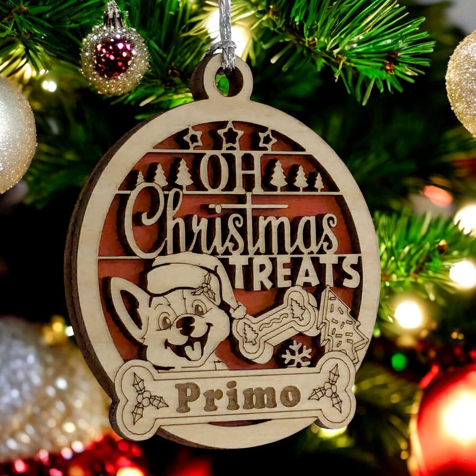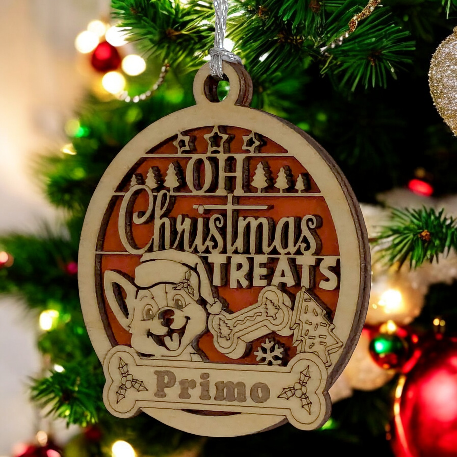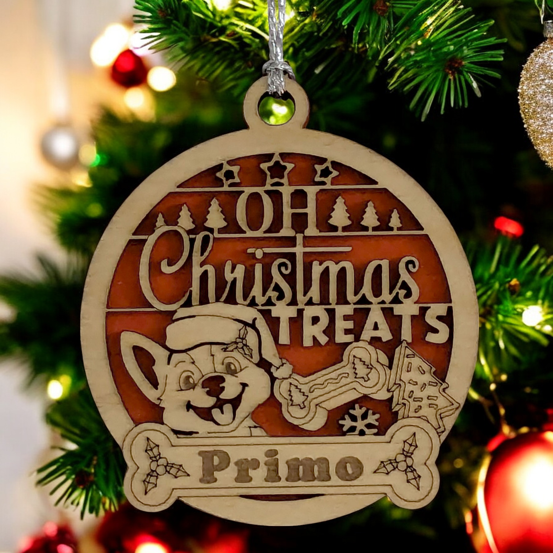 Celebrate your furry friend this holiday season with our adorable personalized dog Christmas ornament, handcrafted with love in Oregon, USA. This charming 3-inch round ornament features a delightful cartoon-style dog surrounded by tasty treats and the playful phrase "Oh Christmas Treats," making it the perfect addition to your holiday decorations.