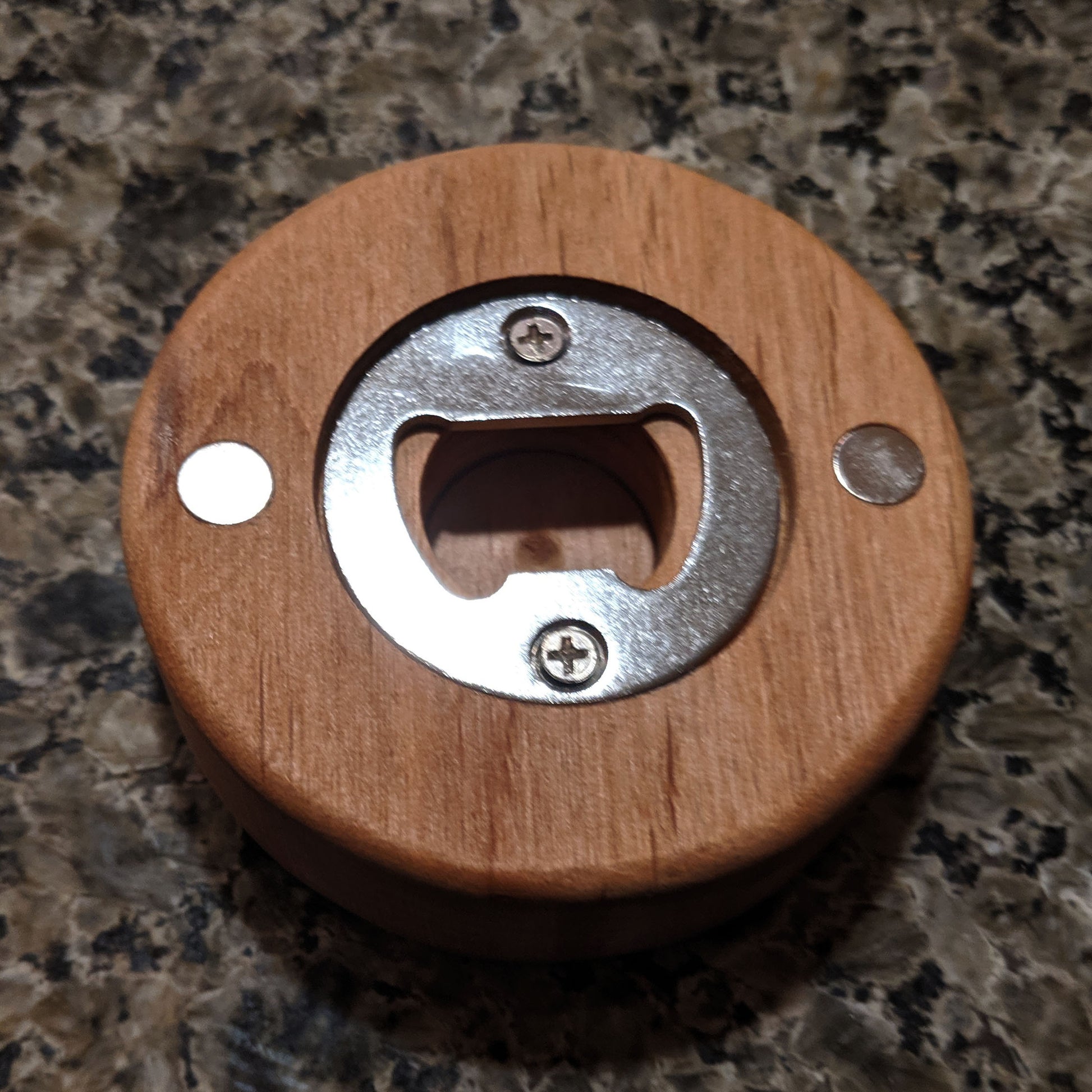 This handcrafted 3-inch round Alder wood bottle opener brings humor and functionality to your kitchen, man cave, or outdoor cooking space. Made from premium Alder wood with a sturdy 1-inch thickness, this unique opener features a durable metal insert for effortless bottle opening.