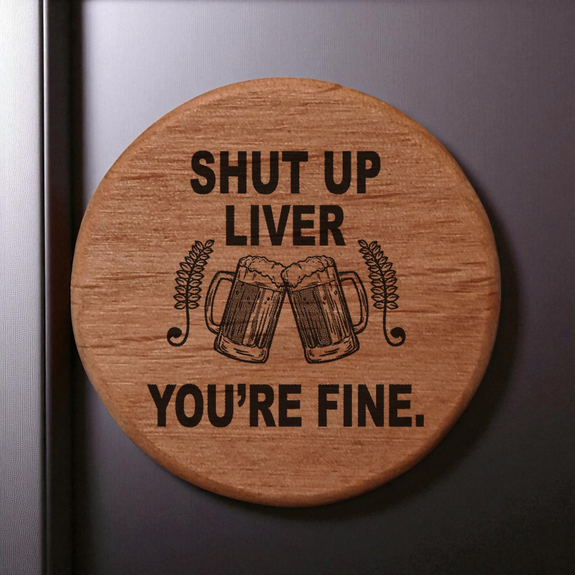 Shut Up Liver You're Fine Bottle Opener - 3" Round Alder Wood with Magnets for Fridge BBQ Grill - Funny Beer Gift with Clinking Mugs Design - Bar Accessories