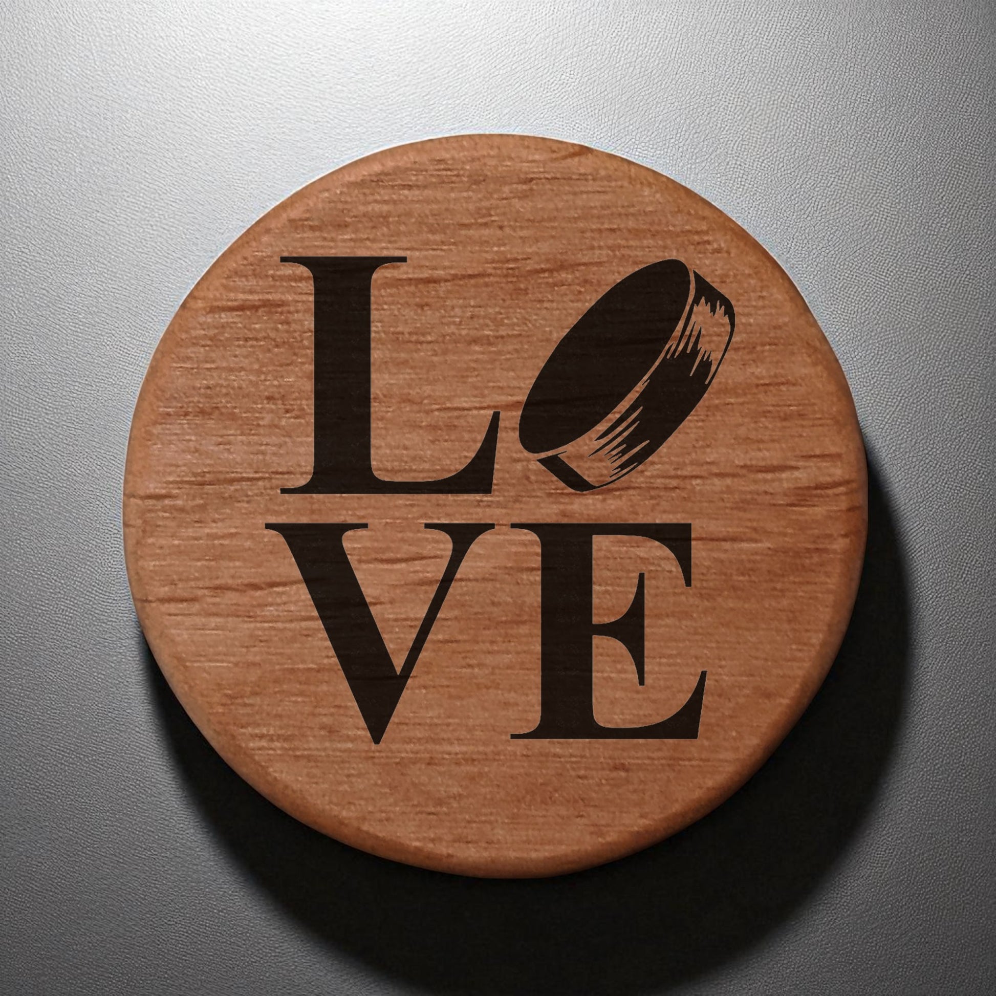 - Laser-engraved hockey puck "LOVE" design